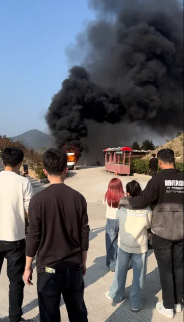 从网友提供的现场视频和图片可见,事发时天气晴朗,观光车燃起熊熊大火,黑色浓烟直冲天际,在空旷的景区内格外醒目。