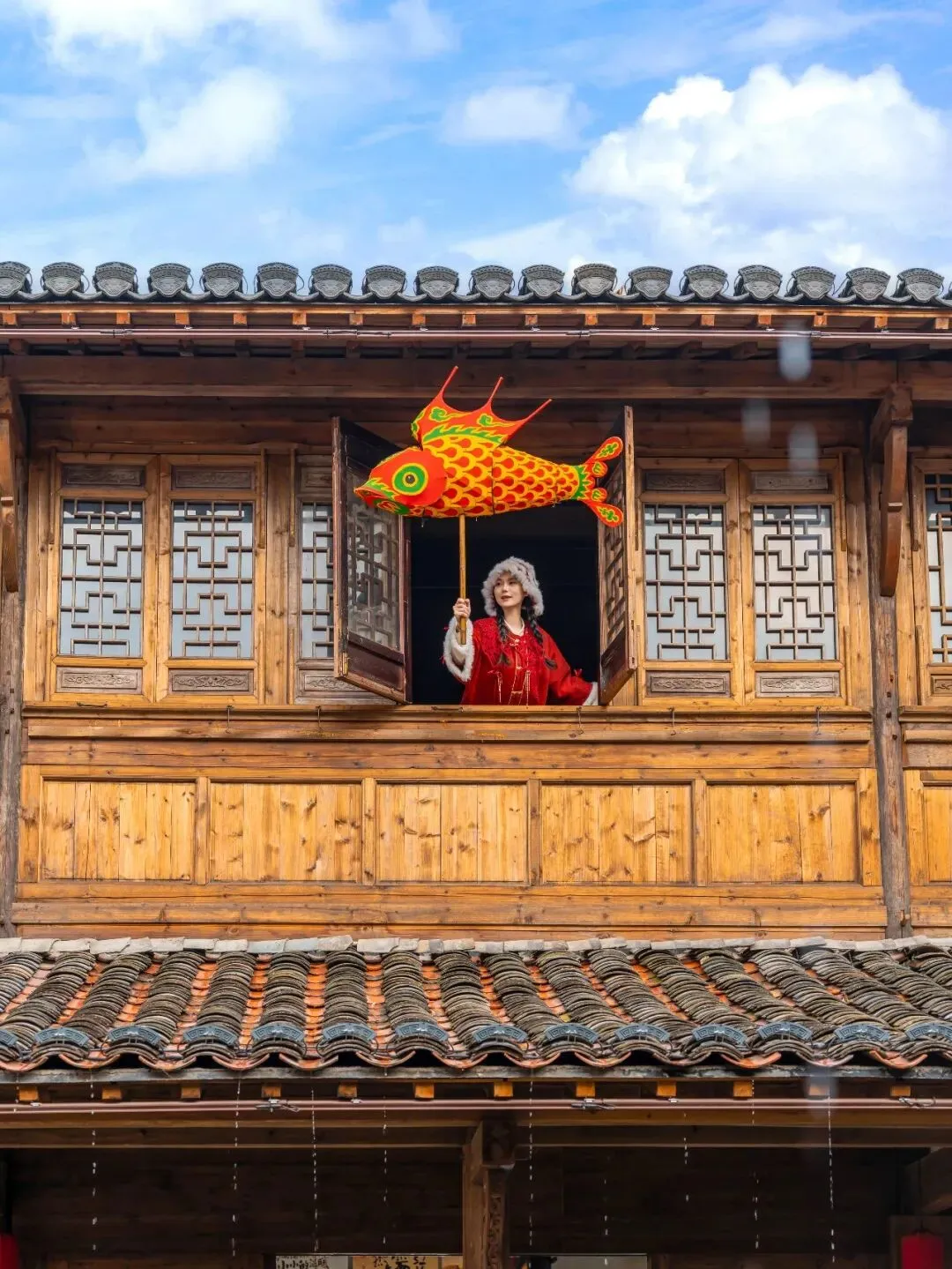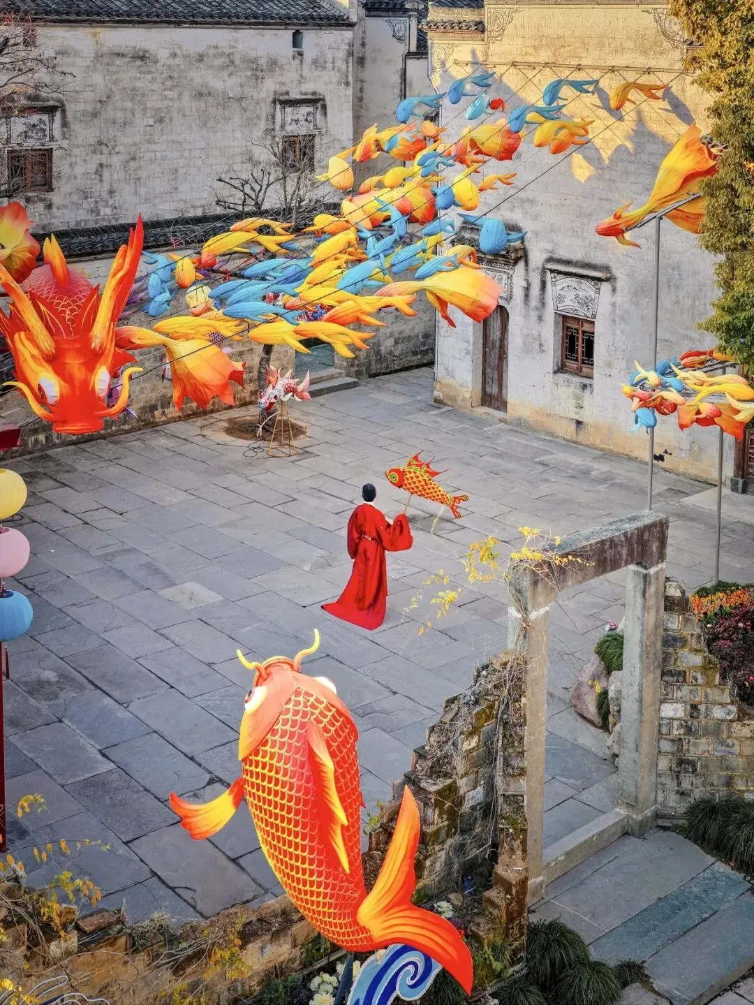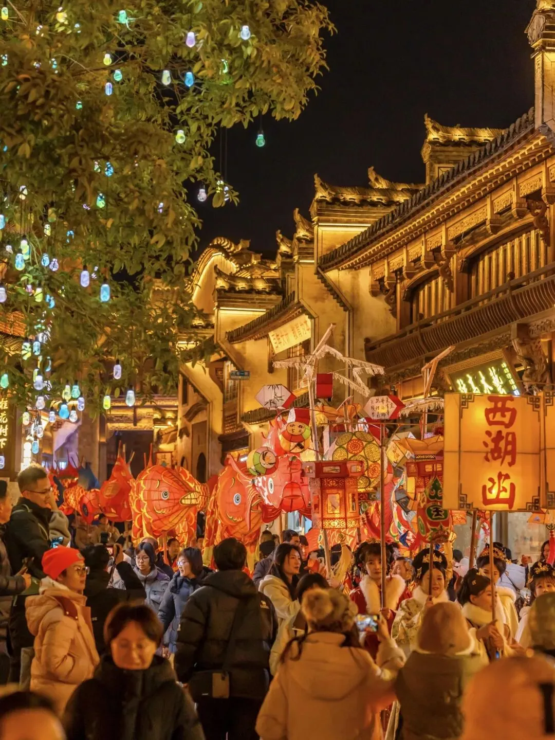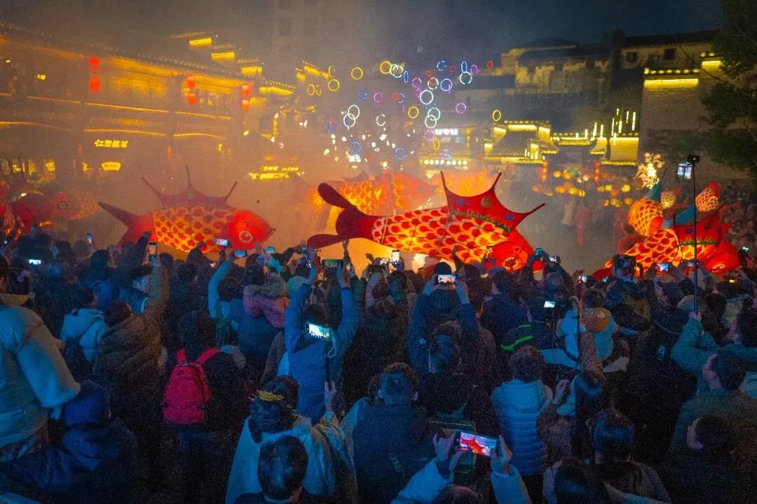 一盏盏鱼灯在街巷中摇曳穿行,游客争相跟随,摸摸鱼头、碰碰鱼尾,祈愿新的一年“年年有余、福运长流”。