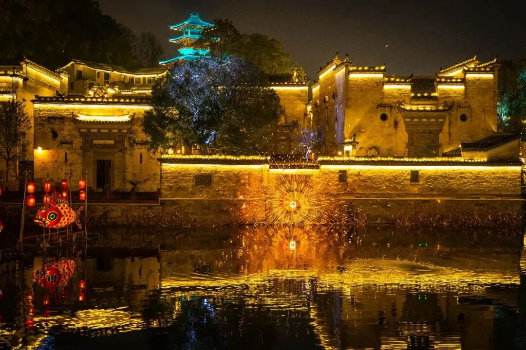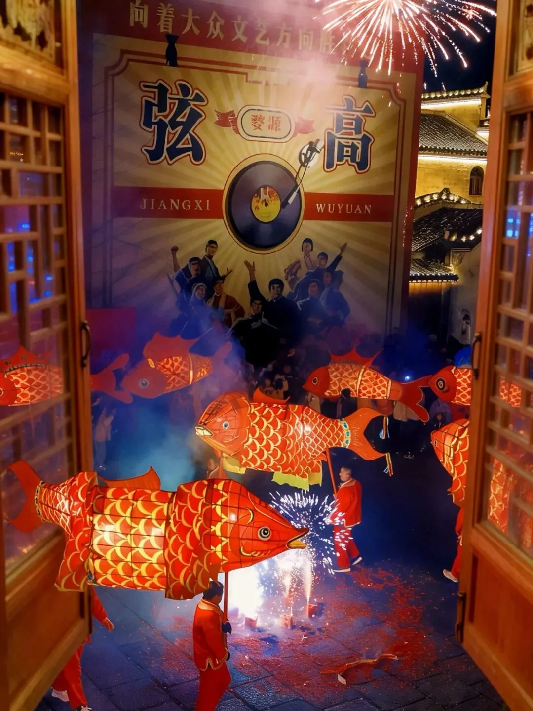 夜晚鱼灯巡游流光溢彩,火树银花热闹非凡。