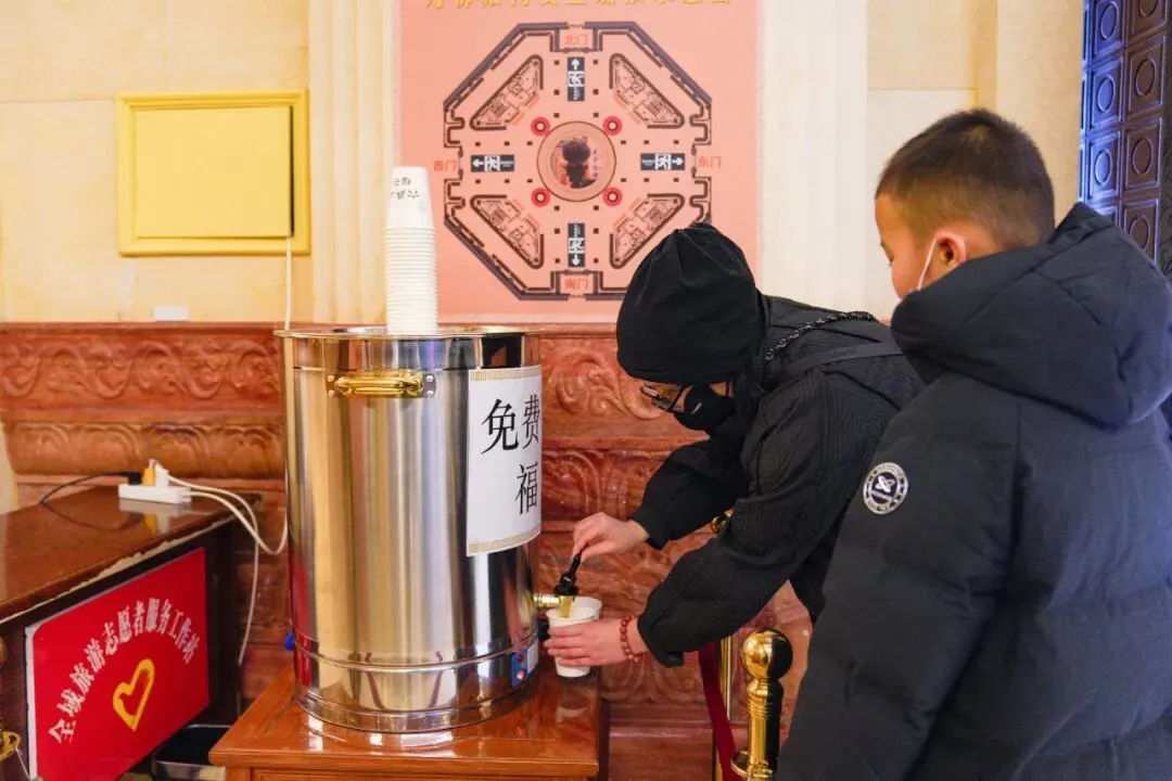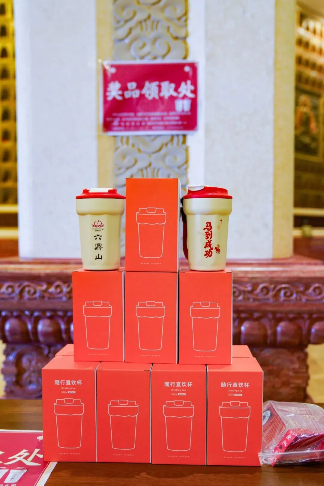 检票口及艺术馆,暖心福茶品鉴暨限量文创福杯申领活动现场最为火爆,长队从活动点位蜿蜒延伸,游客们有序等候,脸上满是期待。景区在张笑天文学馆、艺术馆等处还设置了福茶领取处,方便游客在游览途中随时驻足品鉴,沉浸式感受新春暖意与文旅底蕴。煮制福茶的香气袅袅升腾,弥漫在景区入口及各领取处的空气中,工作人员有条不紊地为游客斟茶递杯,一句句新春问候暖意融融。印刻着六鼎山标志与马年限量版文创福杯,兼具实用性与纪念价值,成为游客追捧的“新春爆款”。