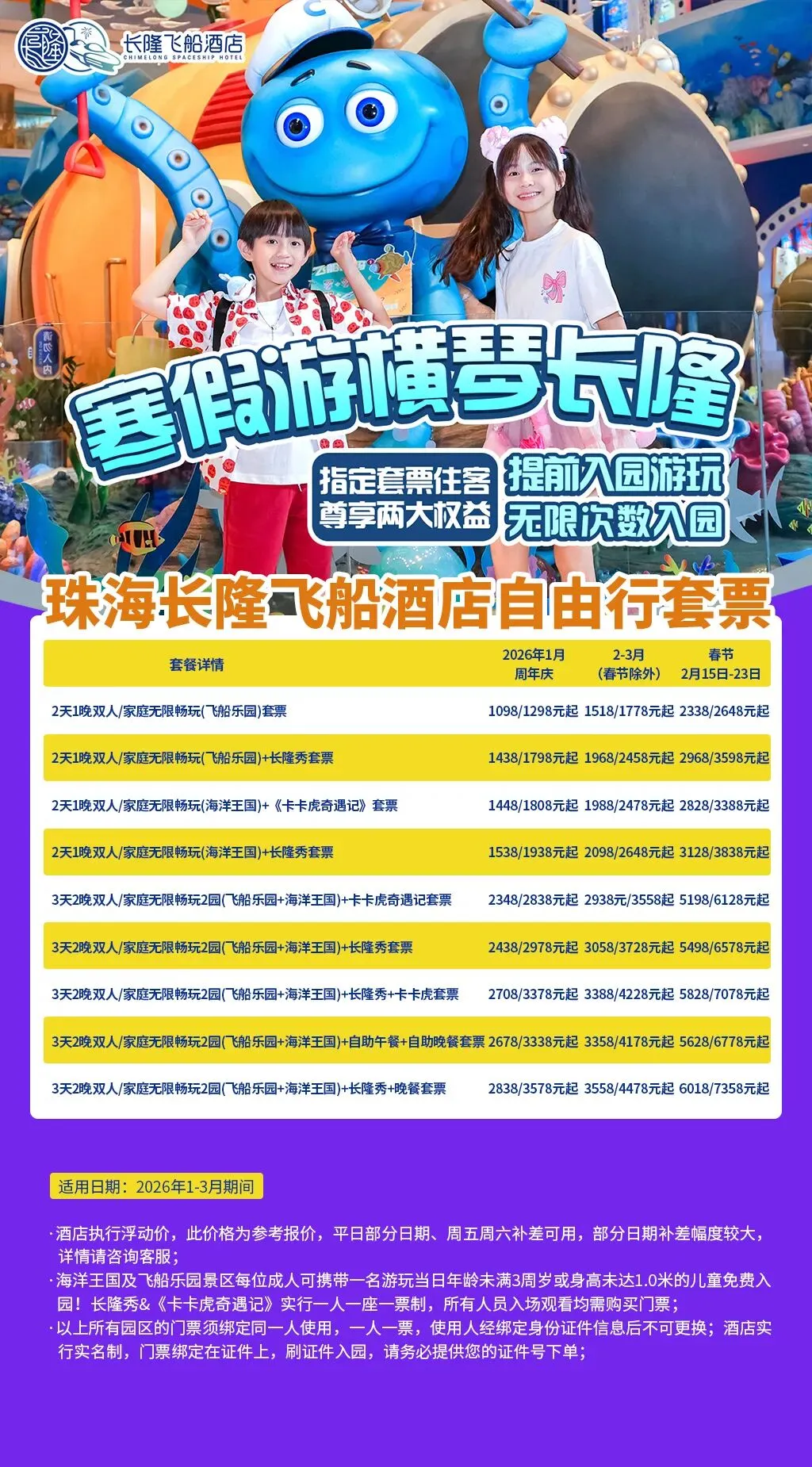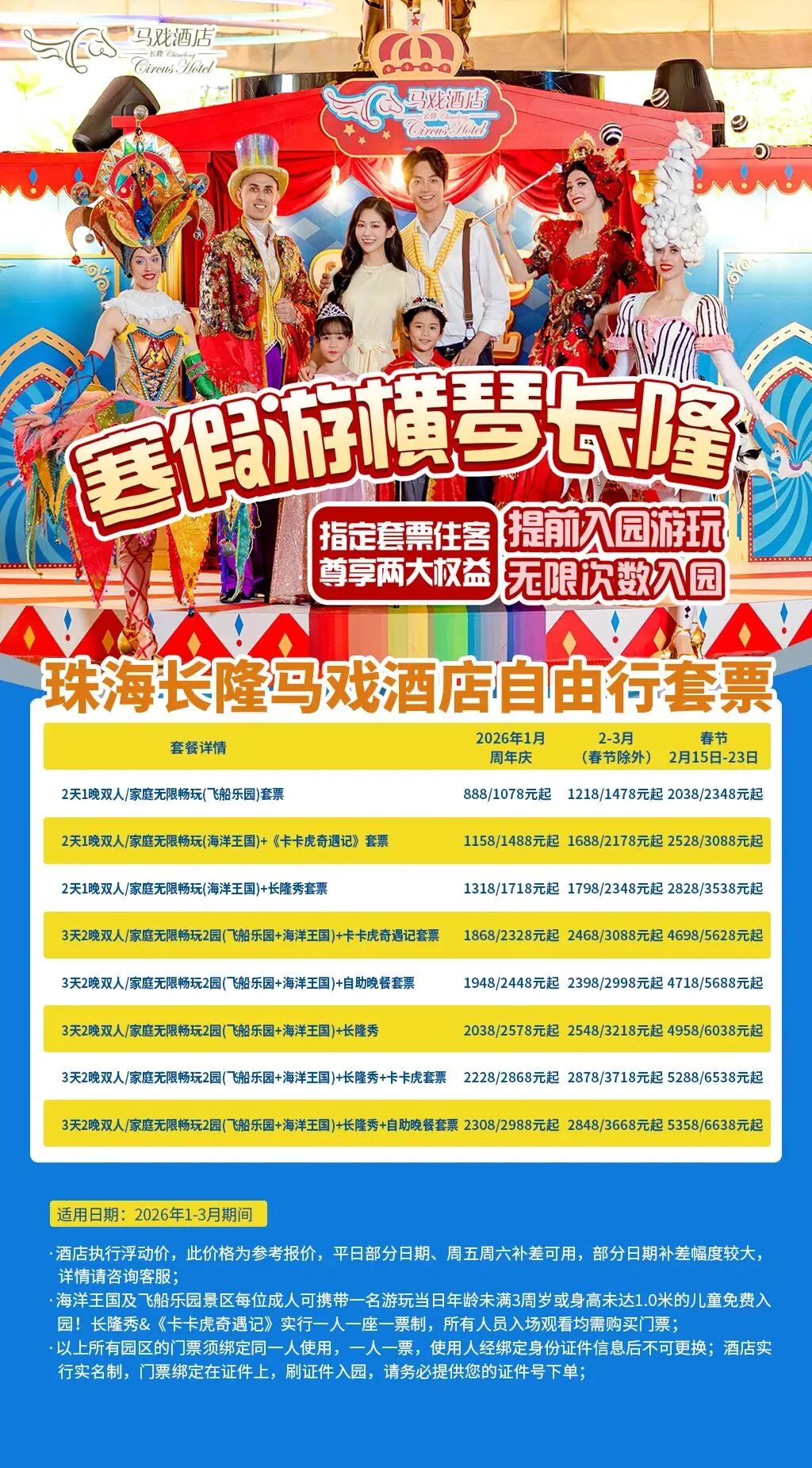 *珠海长隆套票2天1晚只包含海洋王国/飞船乐园(2选1),3天2晚均可以包含2个园区游玩,性价比更高,如需【珠海长隆大马戏】请提前告知客服查看是否有组合优惠票(比单独购买门票更划算哦~!)。