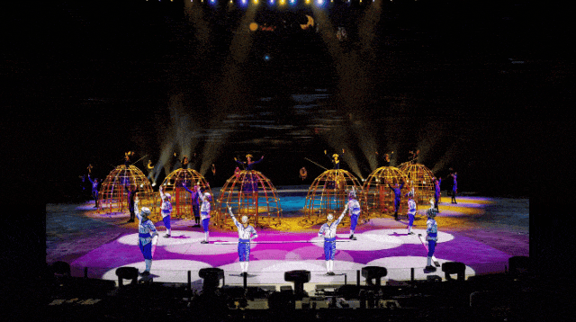 3、《横琴秀》:全新升级的精彩表演,270°全景式环形舞台,搭配灯光交织出各种色彩,为舞台增添了动感和变幻
