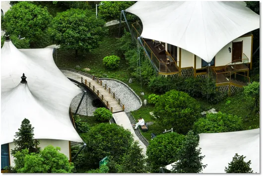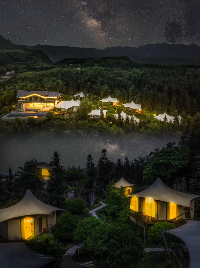 酒店深藏于僰王山镇永寿村9组,坐拥5300平方米自然秘境,以高端特色度假体验为核心,匠心打造7栋星空帐篷,最大限度保留原始地貌,形成与自然共生的独特景观建筑群。