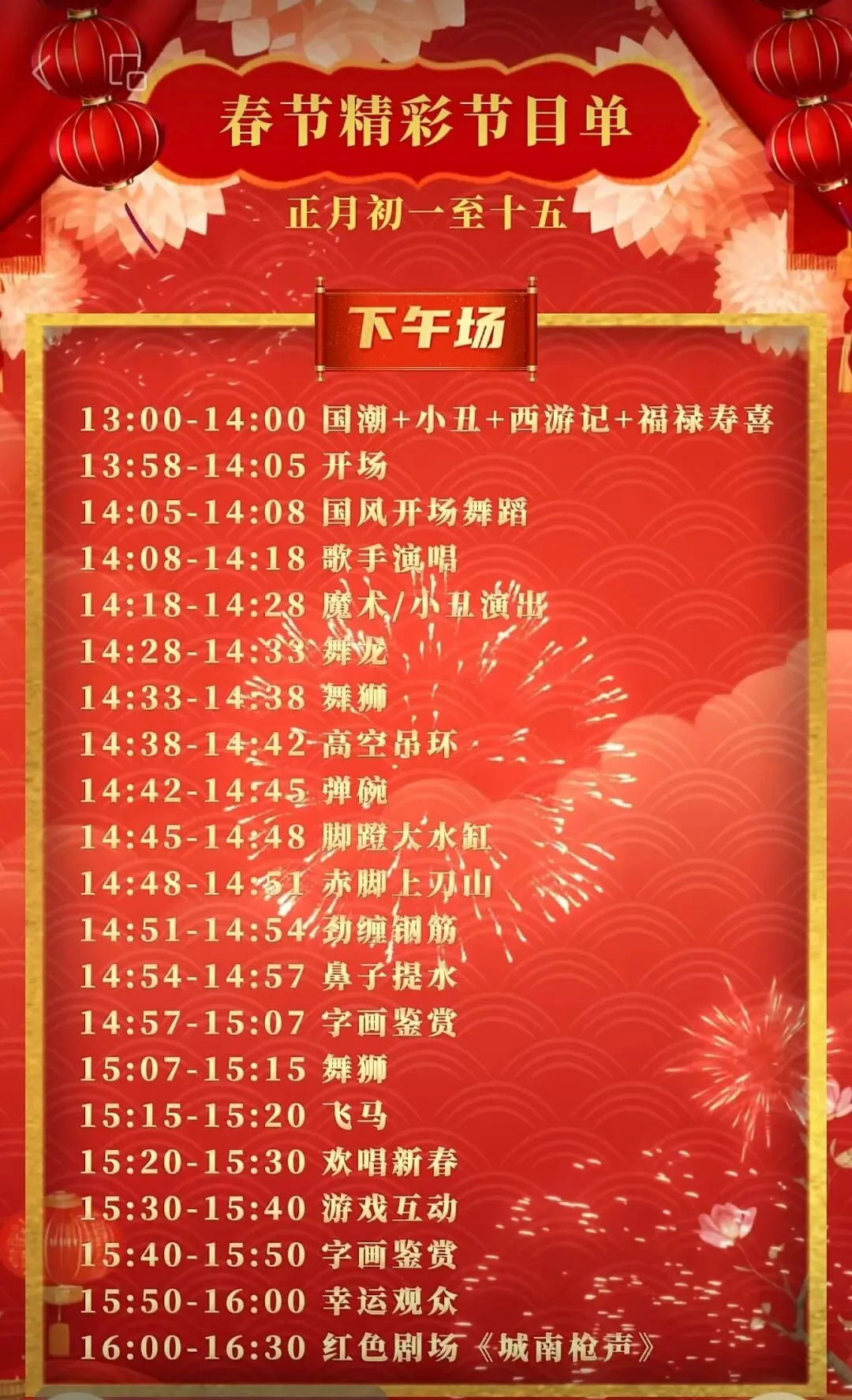春节期间,景区内有文博盛宴,年味十足。从正月初一至十五,庆云文博园每日活动62场,精彩不打烊:方阵巡游热闹非凡、实景演艺生动鲜活、焰火花灯璀璨闪耀;配套美食文创市集、雪乐园体验区,还有红色剧场沉浸式演出温情呈现,让大家在逛市集、品小吃、观周展、玩乐园、赏非遗中感受地道庆云年俗。