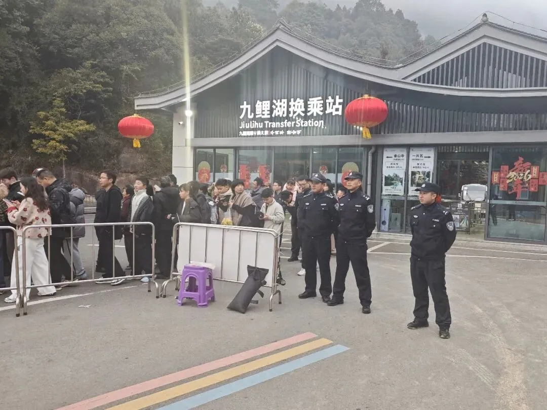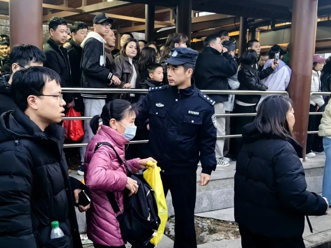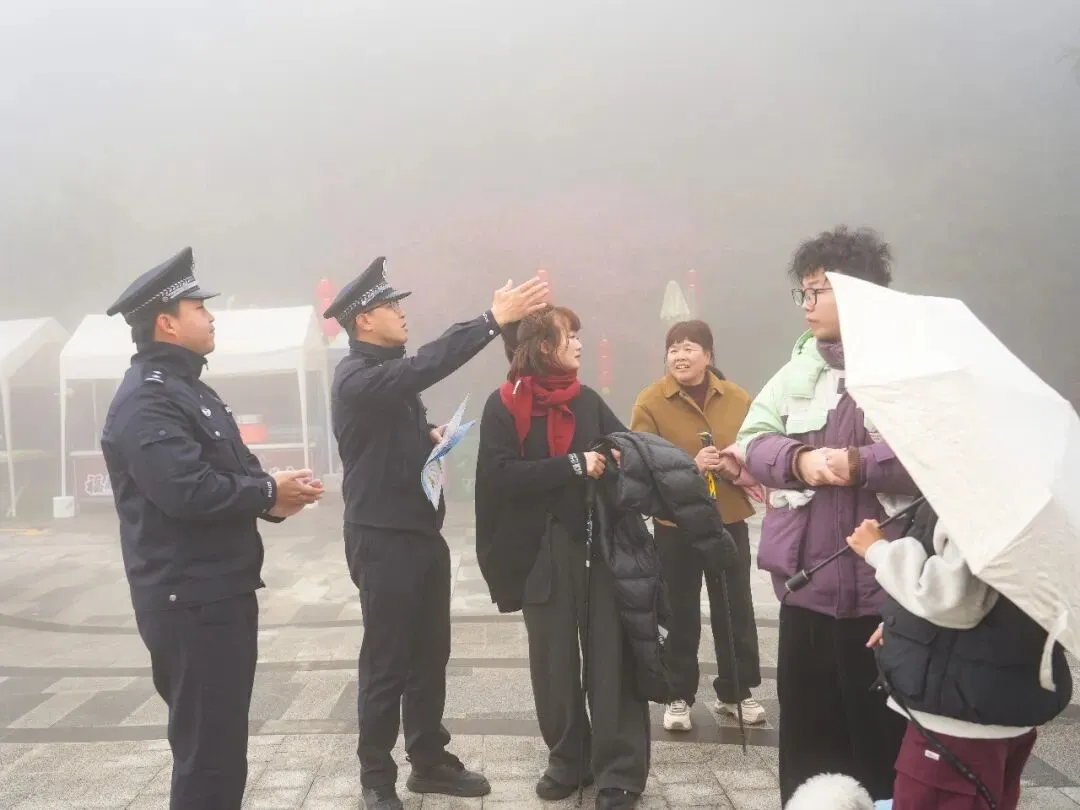 “山上气温比山下低、风也大,请大家务必携带好保暖衣物。”“脚下步道有青苔,行走时请注意防滑!”巡逻途中,民警辅警一边耐心提醒游客注意事项,一边主动为游客介绍景点特色和游玩路线。从山脚的游客中心到山顶的观景平台,他们的身影无处不在,及时疏导拥挤的人流、规范着游览的秩序,用不间断的守护为游客的新春之旅保驾护航。
