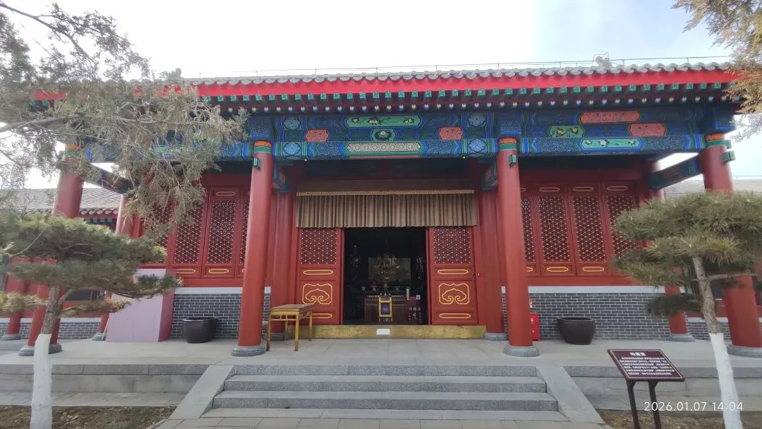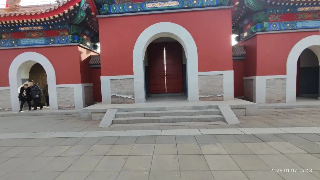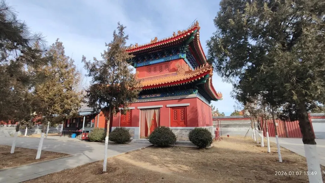 盘山文殊院山门为明清官式风格的三门式殿堂山门,是标准“三门”——空门(中门,最大,普通人不走;仅僧人、法会、贵宾使用)、无相门(右门,游客/信众主要进门)、无作门(左门,主要出门)。象征“戒、定、慧”三解脱门,又称智慧门、慈悲门、方便门。中间主门宽大供通行,两侧次门稍小;砖木结构,灰瓦覆顶,额枋与雀替有传统彩绘,整体规整大气。