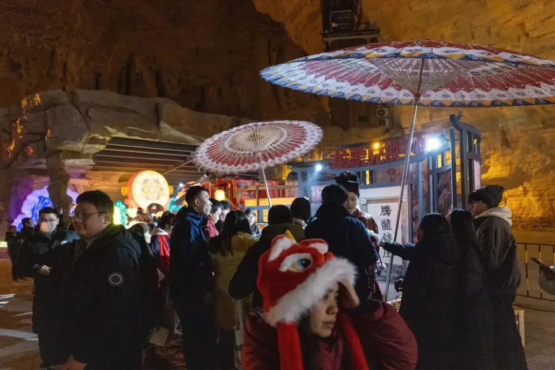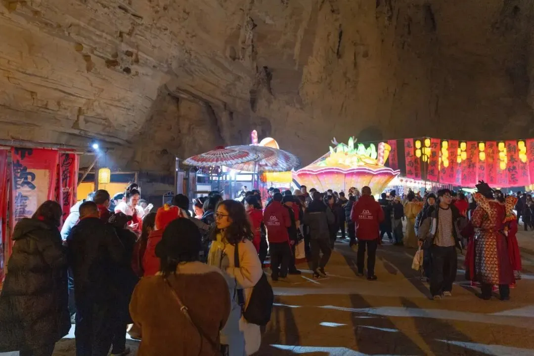 腾龙洞景区的“腾龙映灯彩,骏马踏春归”灯会华彩启幕,自贡非遗彩灯与亿万年喀斯特溶洞奇观完美融合,骏马踏春、金色巨龙等灯组熠熠生辉。创新的灯景+NPC沉浸式体验,让土家婚俗、龙王对弈、财神巡游等互动趣味十足,赏溶洞奇景,品地道土家风情,视觉与体验双重拉满。
