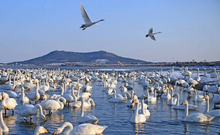 荣成的天鹅湖,每年11月到3月是大天鹅的越冬期,这个时候去能看到成百上千只天鹅在湖面上游,白色的天鹅配上冬天的芦苇,那种画面会让你重新理解什么叫候鸟迁徙,这些天鹅从西伯利亚飞过来,就为了在这过冬,它们选这里是因为这里的环境适合它们,不是因为这里有游客。你站在湖边看着它们梳理羽毛、觅食、休息,那种自在的状态会让你明白什么叫自然的秩序。