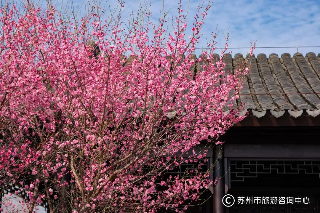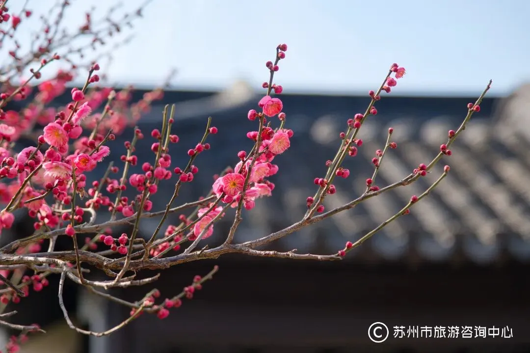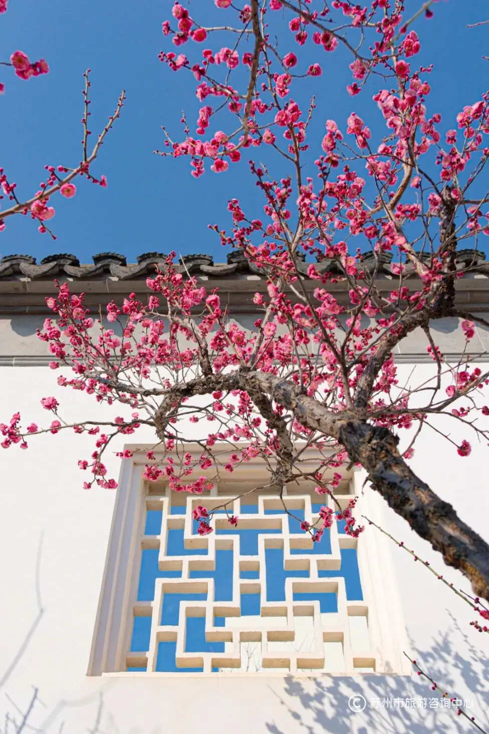 秋香园位于唐寅园附近,清新雅致的红梅与白梅,映衬着粉墙黛瓦与亭台轩榭,更显古韵悠悠。