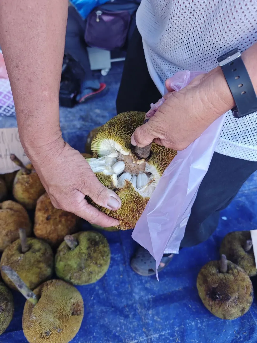 早市吃到甜糯新鲜的沙巴果,现买、现开、现吃。小摊的女主人时不时给我们递纸巾。