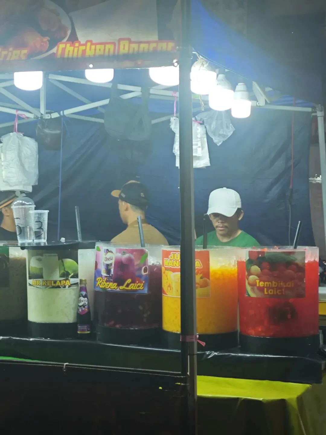 夜市上看到的五颜六色的大桶饮料。