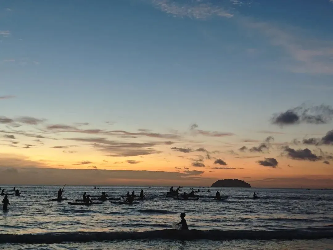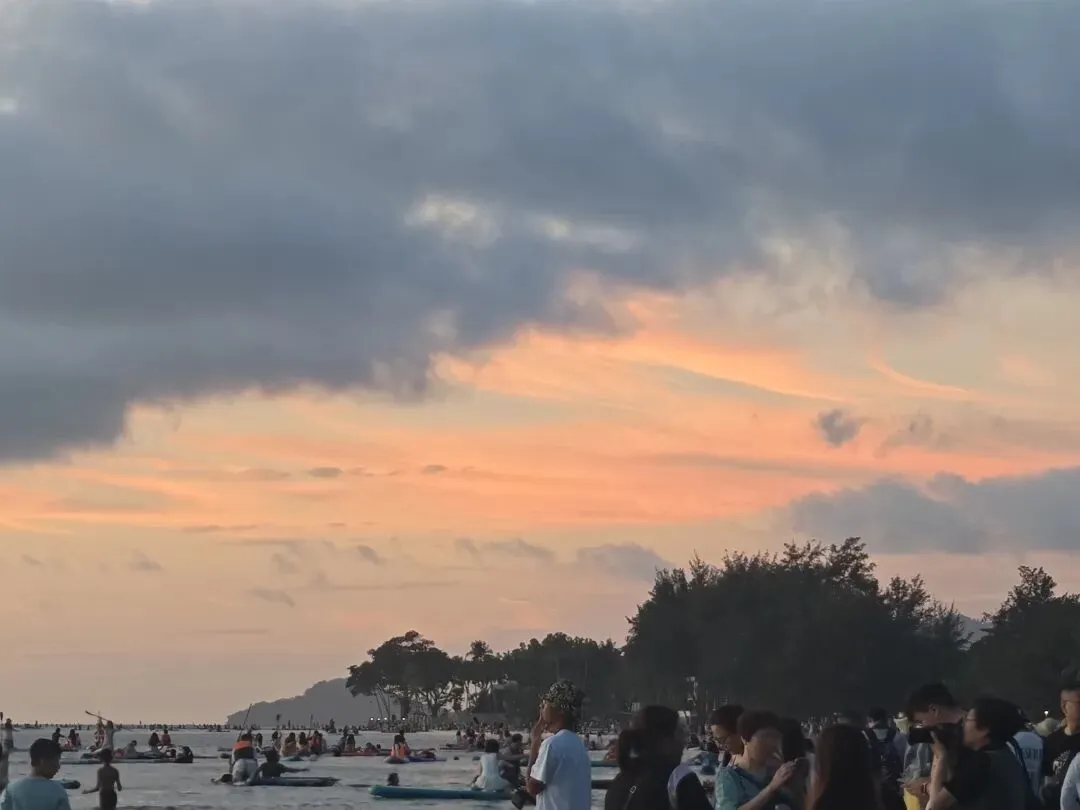 丹绒亚路的沙滩上,全是追着落日、等候晚霞的人,近处热闹,远处温柔。