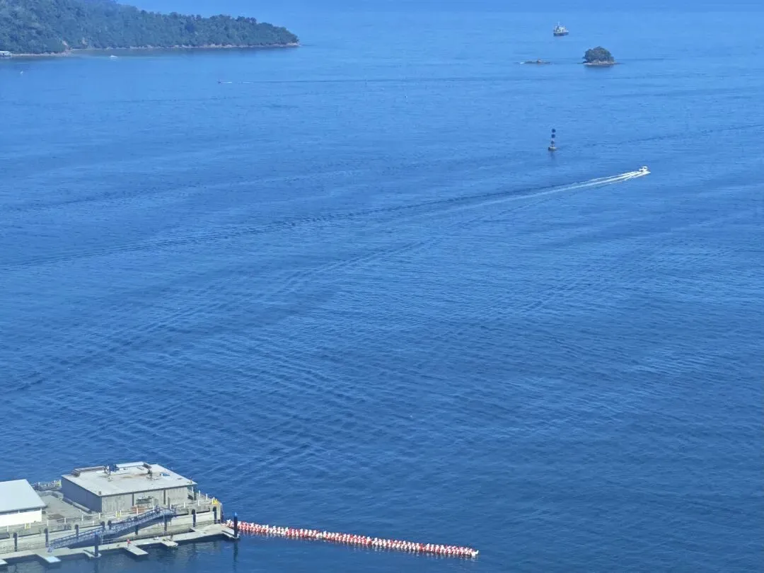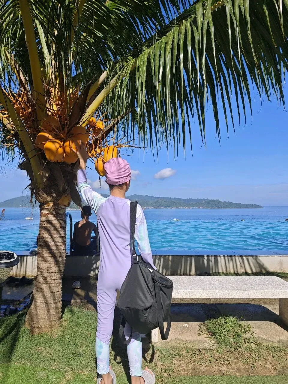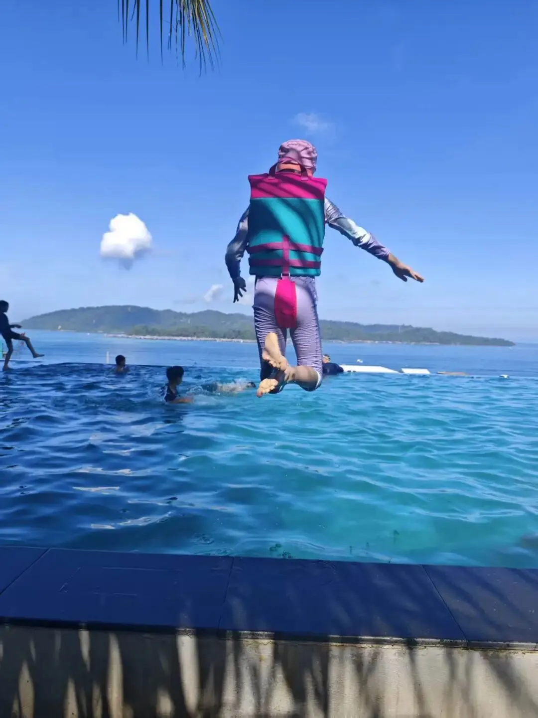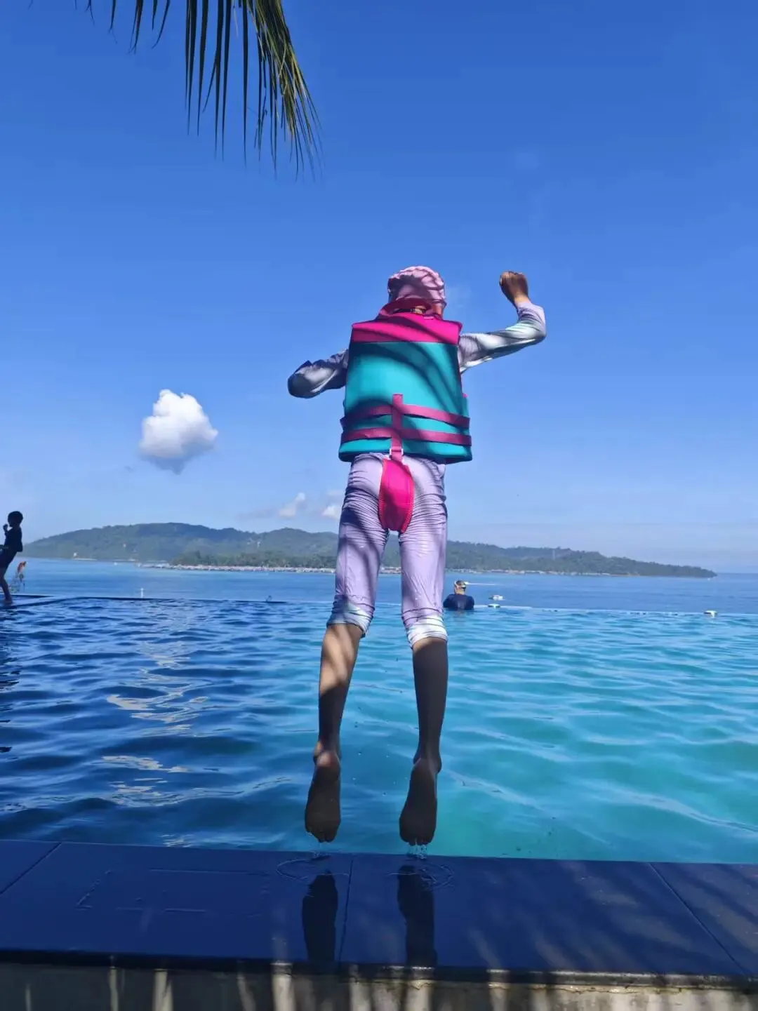 吃完早餐,带小马去每天必打卡的无边泳池玩水。