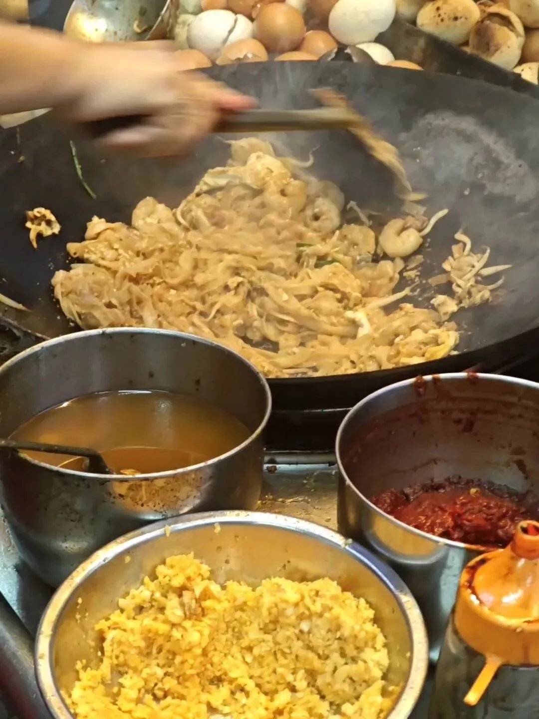 太好吃了,我也去看她过是怎麽做的。大火快炒,加了猪油渣的粿条不粘锅,加上黑酱油、配鲜虾、血蚶、腊肠、豆芽、鸭蛋…