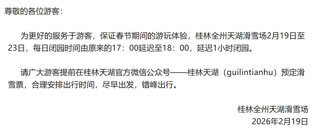 2月19日-23日延迟1小时闭园公告