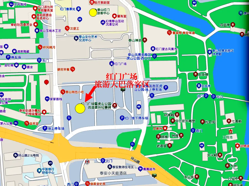 旅游大巴落客区 旅游大巴落客区设置位置 红门广场旅游大巴落客区设置在环山路与红门路交叉口东北侧红门广场内