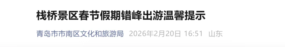 春节假期,栈桥景区作为青岛市核心游览地标,迎来客流高峰。为切实保障广大游客的游览安全与体验质量,经综合研判,春节假期每日10:00至15:00为客流峰值时段。届时,景区将对栈桥桥头实施分流管控及限时入桥等措施,动态调节客流密度。为让您尽享新春海滨美景,特温馨建议:请合理规划行程,尽量避开高峰时段,错峰出行,避免扎堆聚集。游览期间,敬请遵守现场管理规定,配合工作人员引导,共同维护安全、有序、文明的游览环境。衷心感谢您的理解与配合!青岛海滨景区管理服务中心祝您新春快乐,旅途愉快!