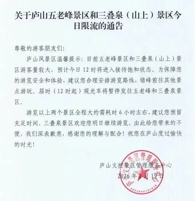 2月19日,多家景区发布公告启动限流措施: