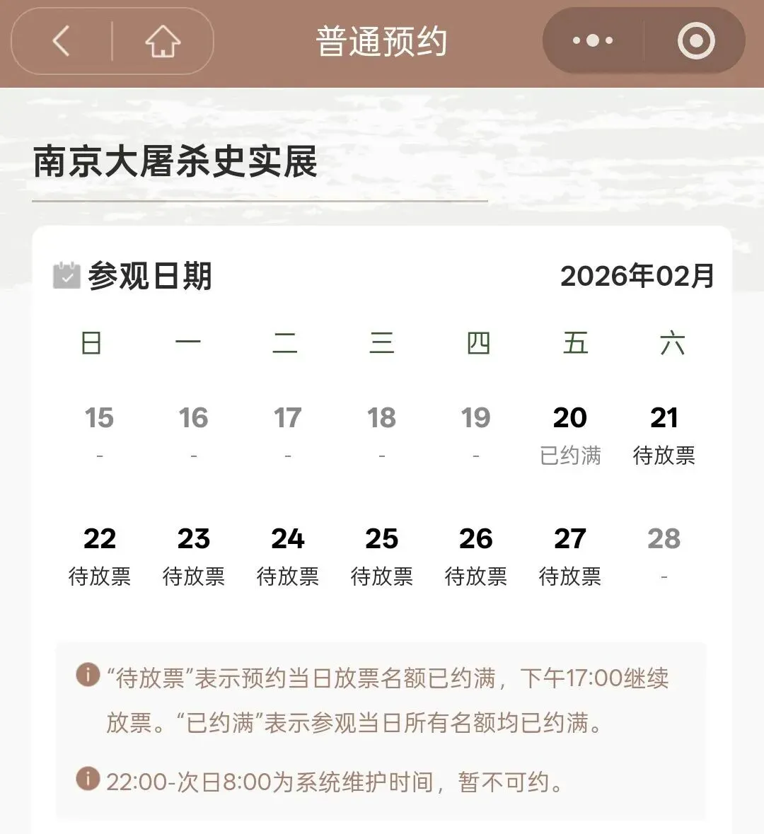 侵华日军南京大屠杀遇难同胞纪念馆、南京大屠杀史实展2月20日已约满,2月21日至2月27日预约显示待放票态。