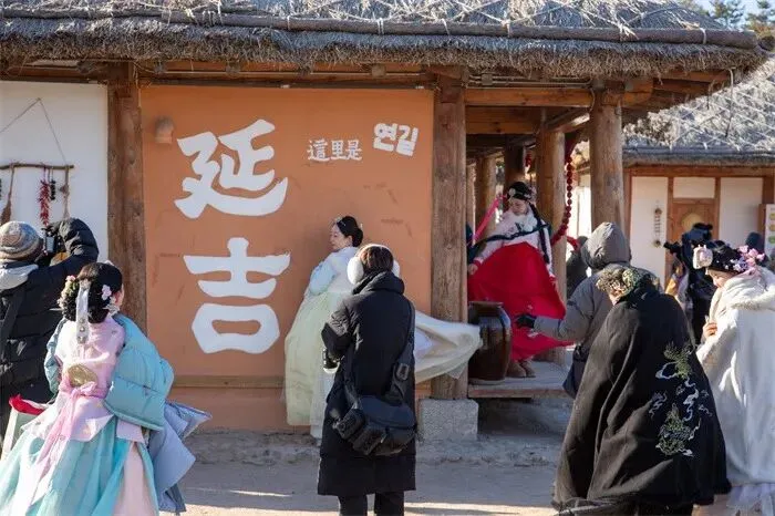 中国朝鲜族民俗园作为新春顶流打卡地,“公主”旅拍热度依旧。园内非遗体验精彩纷呈,游客可品尝、制作非遗米糕和朝鲜族米酒。灯光秀点亮园区,十二生肖、民俗元素与光影交融,新春迎宾仪式、伽倻琴独奏、象帽舞互动、雪地蹦迪等活动轮番上演,让景区昼夜皆精彩。