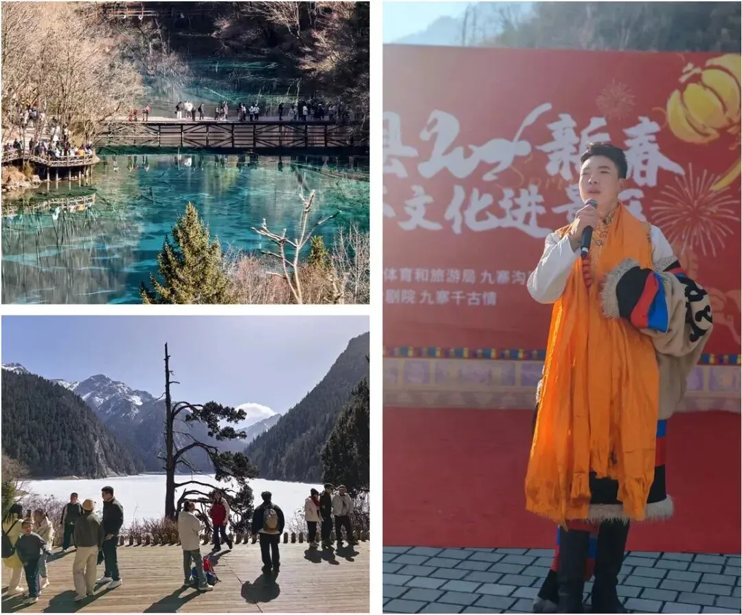 客流满容而不拥挤,美景如画更有序。景区内各景点客流分布均衡,栈道、观景台通行顺畅,拍照、休憩、观景互不干扰。游客们漫步长海、五彩池、诺日朗瀑布、五花海等景点,赏冰瀑、观雪景、拍湖光,纷纷用镜头定格马年新春的九寨盛景。景区智慧调度中心实时监测客流、车流与天气变化,动态调整疏导方案,联动周边景区发布分流信息,引导未预约游客合理调整行程,全域旅游协同高效。同时,九寨沟非遗展演每天上午定时在游客中心广场上演,通过别样方式为广大游客送去新春的祝福。