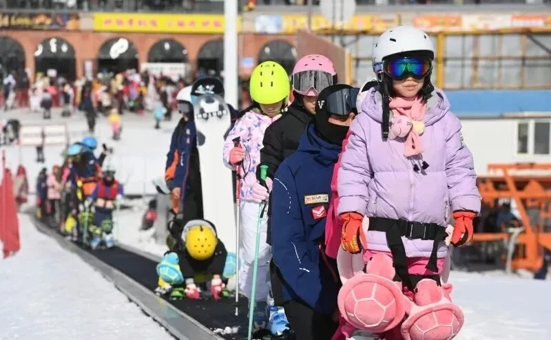 2月19日,丝绸之路山地度假区,小朋友们乘坐魔毯去滑雪。