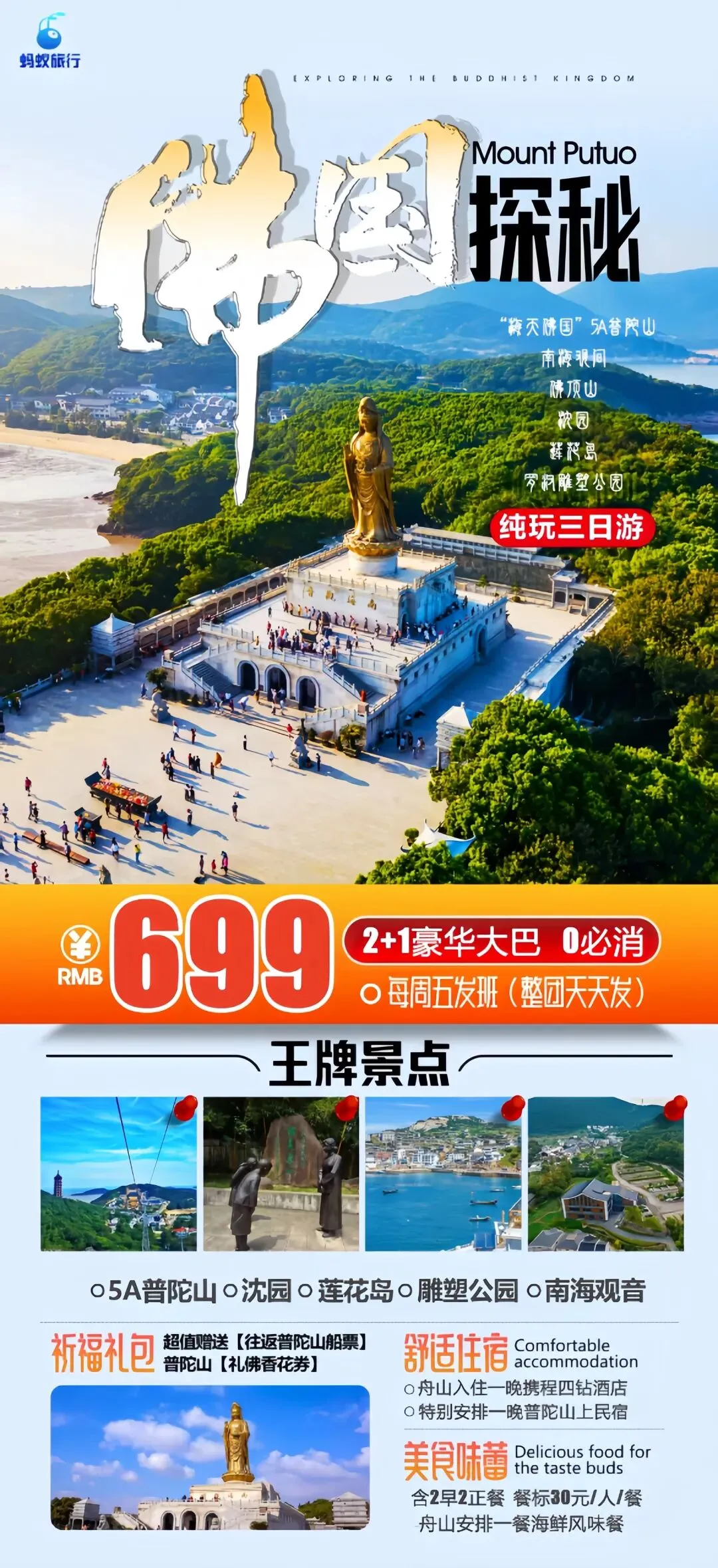 您现在的位置是:首页 > 国内旅游目的推荐 > 正文 国内旅游目的推荐 【潮人旅游】普陀山祈福·纯玩三日游 admin2026年02月20日 19:55:09国内旅游目的推荐6 【潮人旅游】普陀山祈福·纯玩三日游【普陀山祈福·纯玩三日游】👉打卡海天佛国普陀山丨沈园赏花丨莲花岛观海景丨罗汉雕塑园丨🧧特惠价:699元/人🍱2早2正餐,餐标30元/人/餐,升级一餐舟山海鲜风味餐🏠宿普陀山上民宿+升级一晚4钻酒店🎁超值赠送祈福大礼包:普陀山往返船票➕普陀山礼佛香花券🚍全程2+1航空座椅豪华大巴车💎当地专业佛学导游讲解服务❗品质出行❗纯玩0购物❗发团日期:每周五发班(整团天天发)☎️18107050172(微信同号)咨询电话:18107050172(微信同号)长按添加咨询也欢迎进店咨询信息发布 广告宣传旅游交友 婚姻介绍都可以来奉新信息网↓↓咨询电话:18107050172、15079532799 转载请说明来源于"旅荐网",部分内容转载自网络,如有侵权请联系qlwl@foxmail.com删除 本文地址:https://www.15386.cn/post/116568.html 上一篇 景点就是超多人的地方,下次不要搞我,我还 下一篇 “反向旅游”原来这么香! 相关文章 粽情端午·趣玩六一!南京金牛湖旅游度假区端午小长假活动全攻略 乡村微度假研学旅游目的地策划规划设计方案 广州从化 • 天适樱花悠乐园春游赏花旅行攻略|邂逅粉色浪漫:交通、花期、游玩路线与拍照打卡全指南 速看!生态城景区交通出行攻略,春节游玩全靠它! 福州免费游玩攻略|10个宝藏地,0元逛遍有福之州 昆明旅游攻略(本人亲测所有地点感受) 洛阳龙门石窟旅游攻略~ ��盐城3天2晚旅行攻略,跟着本地人玩不踩雷 内蒙古|4天3晚呼市小环线旅游攻略 【慢享受】春日游沈阳—我的私人沈阳旅游攻略(结尾有惊喜) 发表评论 取消回复 评论列表 这篇文章还没有收到评论,赶紧来抢沙发吧~