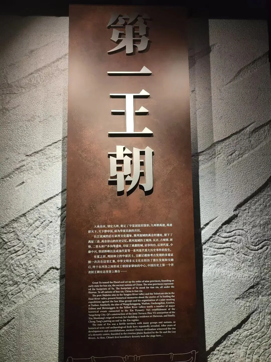 博物馆基本陈列由“第一王朝”、“赫赫夏都”和“世纪探索”三大部分共五个展厅构成。“第一王朝”展厅为基本陈列的第一部分,通过“茫茫禹迹,九州攸同”、“赐土命氏,祚以天下”和“夷夏东西,夏道兴衰”三个单元,串联王城岗、禹会村、新砦、二里头等一系列关键遗址,并结合历史文献记载,科学系统地揭示了夏王朝的发展脉络、历史意义及其在中国早期国家形成中的核心地位。