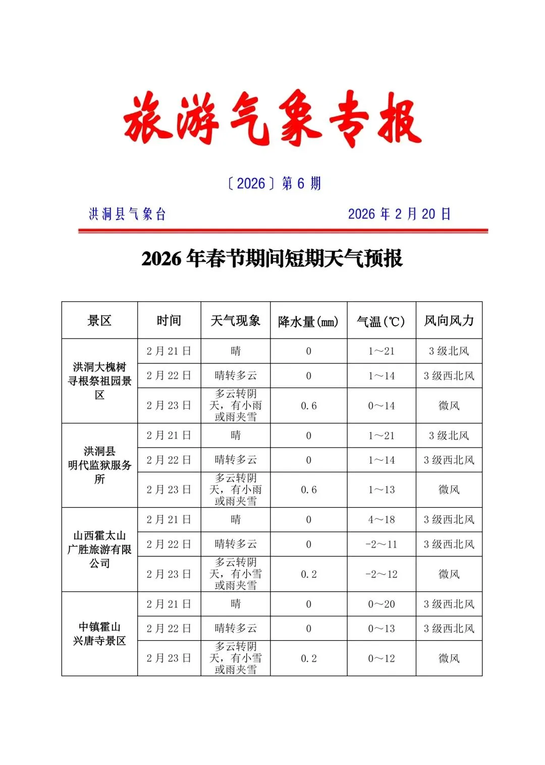 洪洞县2026年春节假期旅游气象专题预报(第6期)