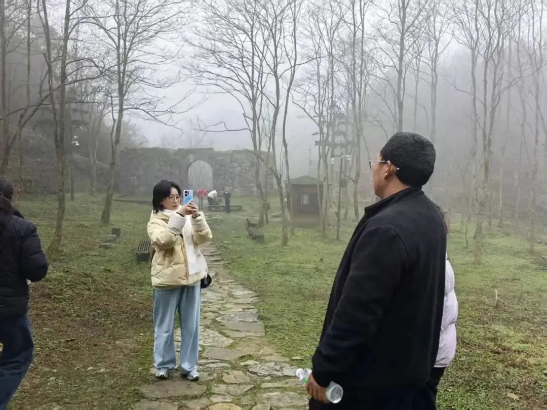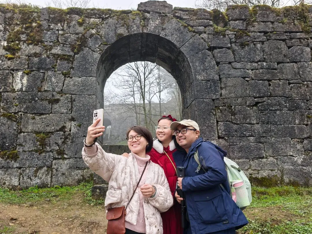 遵义本地游客康园兴也与家人在关口前合影留念:“我们是第一次来海龙屯,趁着过年放假,来感受一下这段历史文化。”