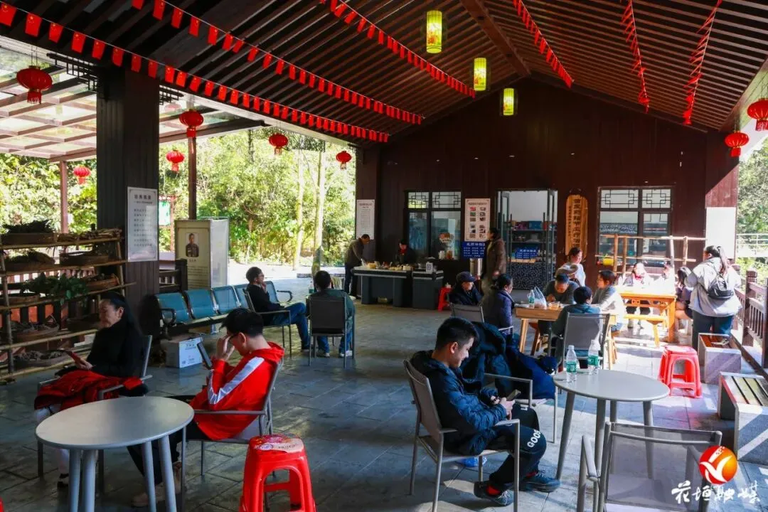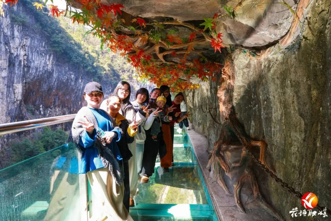 作为花垣县三大核心景区之一,古苗河百瀑大峡谷以雄奇险峻的峡谷风光、清澈灵动的溪流与壮观的瀑布群闻名。春节期间,景区红灯笼高悬,节日氛围浓郁,游客漫步峡谷步道,或驻足观赏飞瀑流泉,或用手机定格美景,或与家人好友合影留念,山间林间洋溢着喜庆祥和的节日气息。