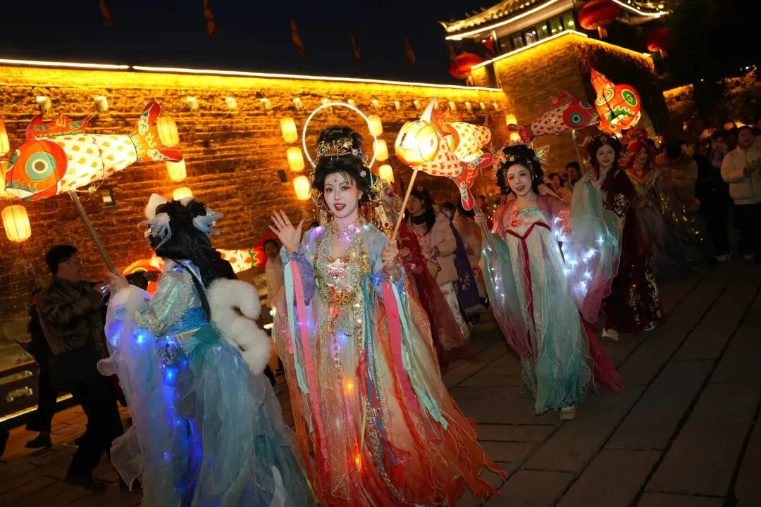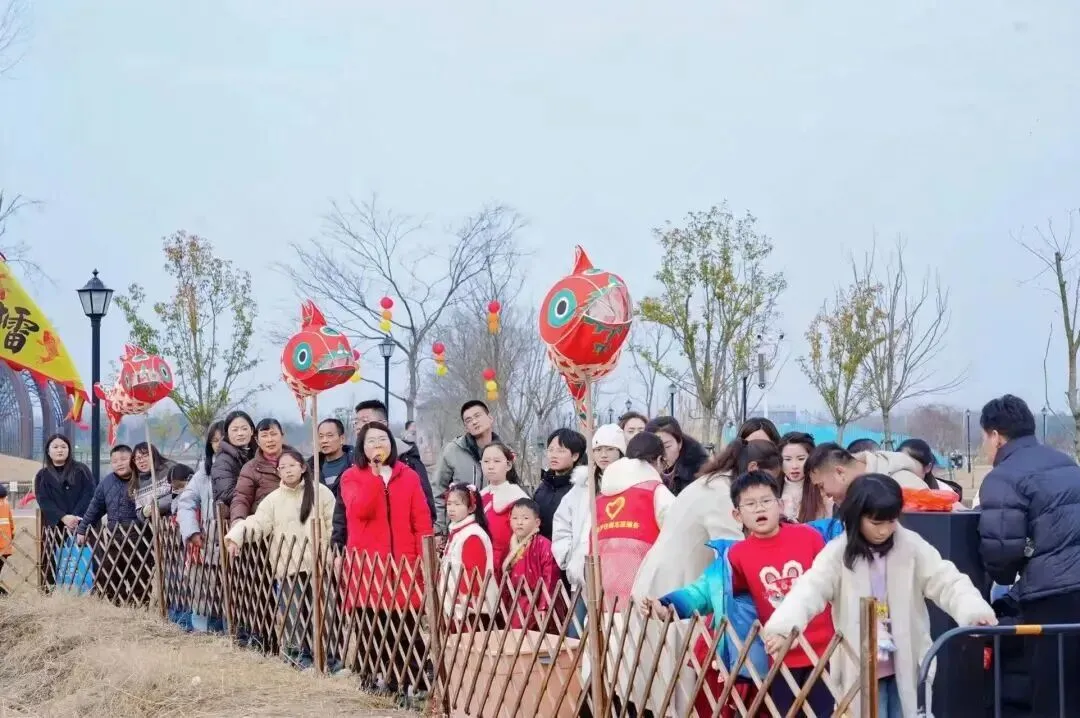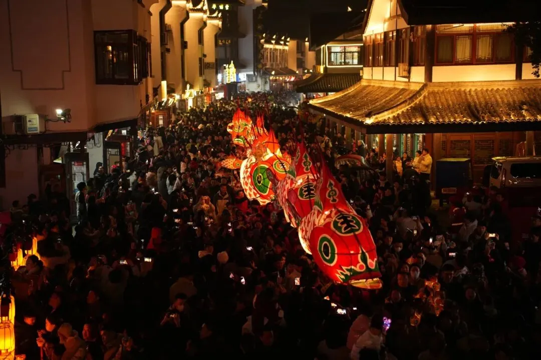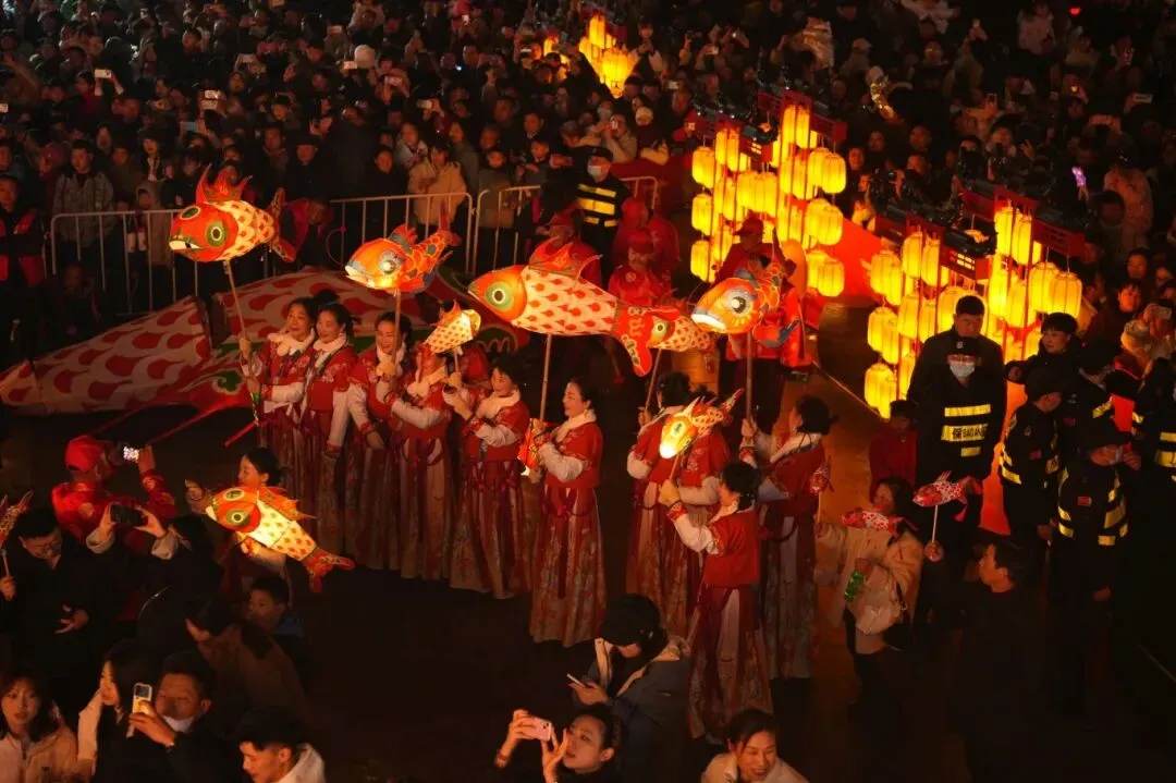 这里不仅有春晚同款的诗意景致,更有沉浸式的年味体验。千人千灯组成的巡游队伍穿梭于青石板古街,成为“行进中的非遗展演”。现场游客接踵而至,纷纷手持春晚同款小鱼灯,跟着巡游队伍沉浸式感受民俗魅力