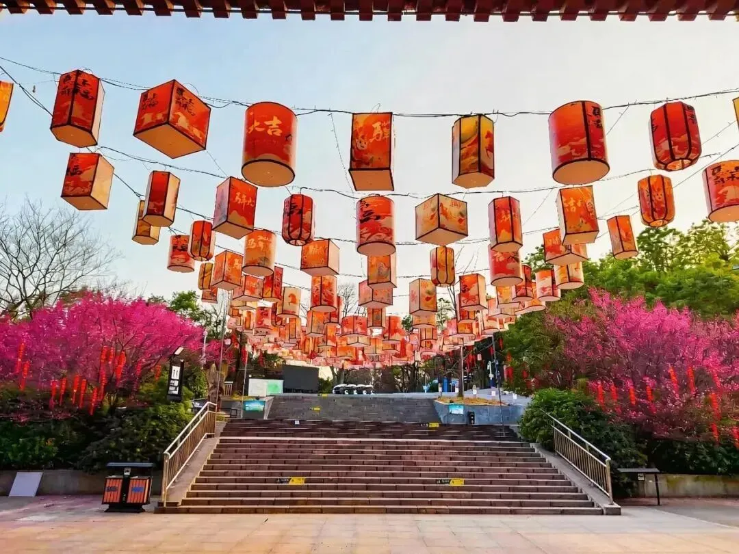 山间早已被五彩斑斓的灯笼装点一新,远远望去如长虹贯日,马年主题美陈随处可见,处处透着吉祥寓意,俯瞰山间灯笼廊道,宛如红绸铺展山间,氛围感直接拉满。