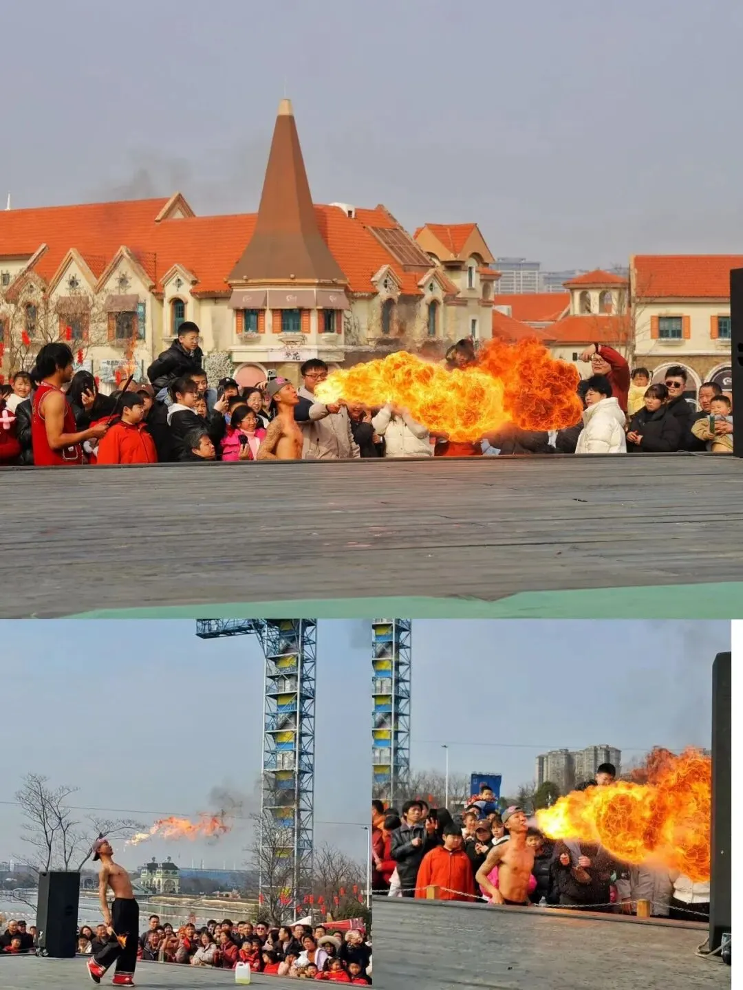 喷火表演惊险刺激,二鬼摔跤诙谐逗趣,空中钢丝绝技令人屏息,还有舞龙舞狮、天女散花等经典民俗展演轮番上演,热闹非凡。
