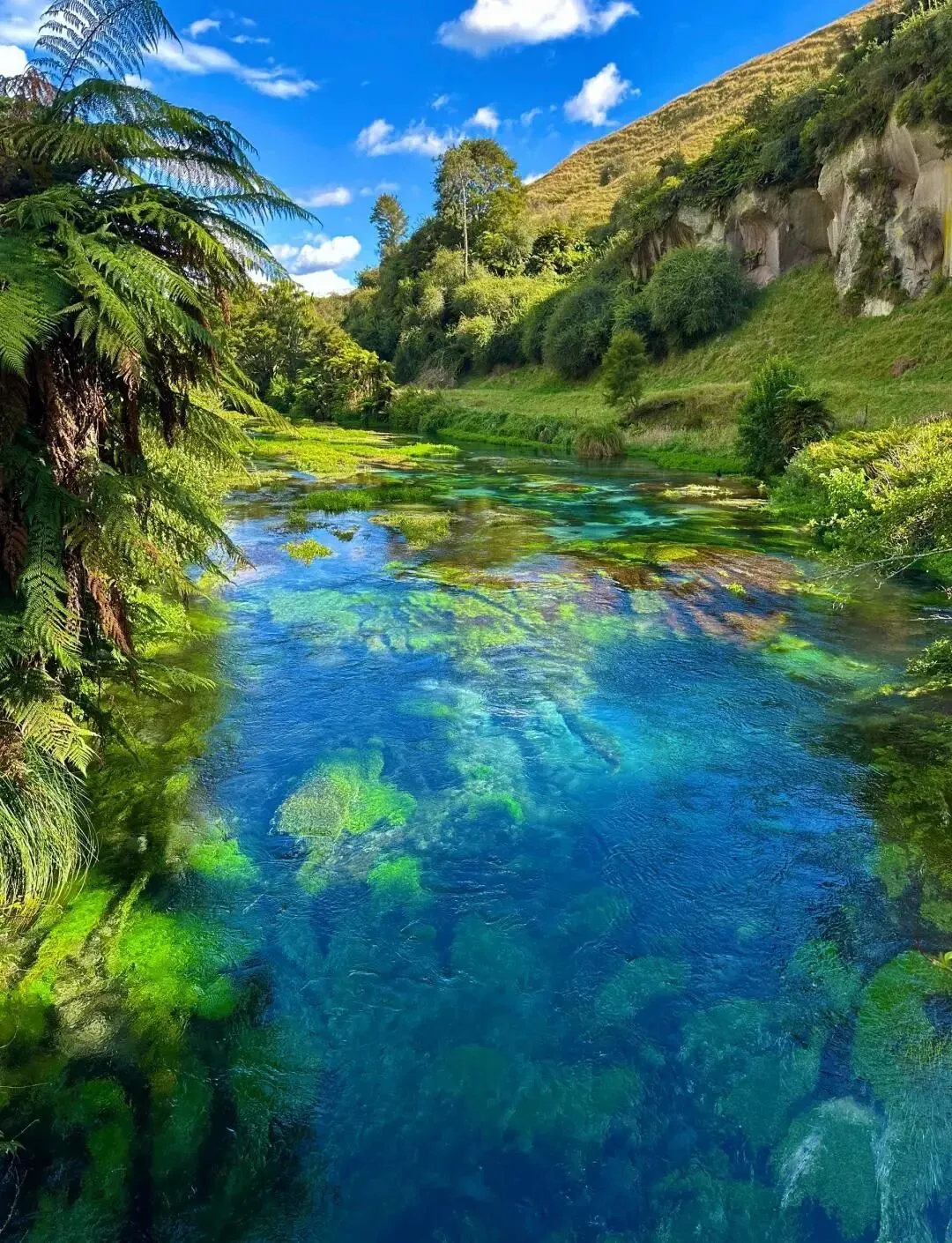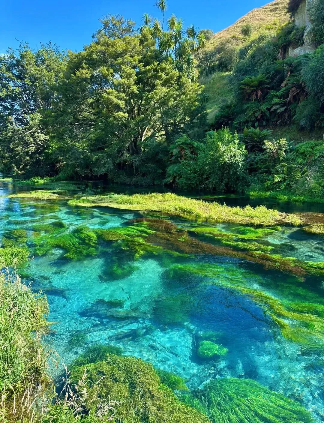 蓝绿是蓝泉主色调,草树斑斓、流清澈底