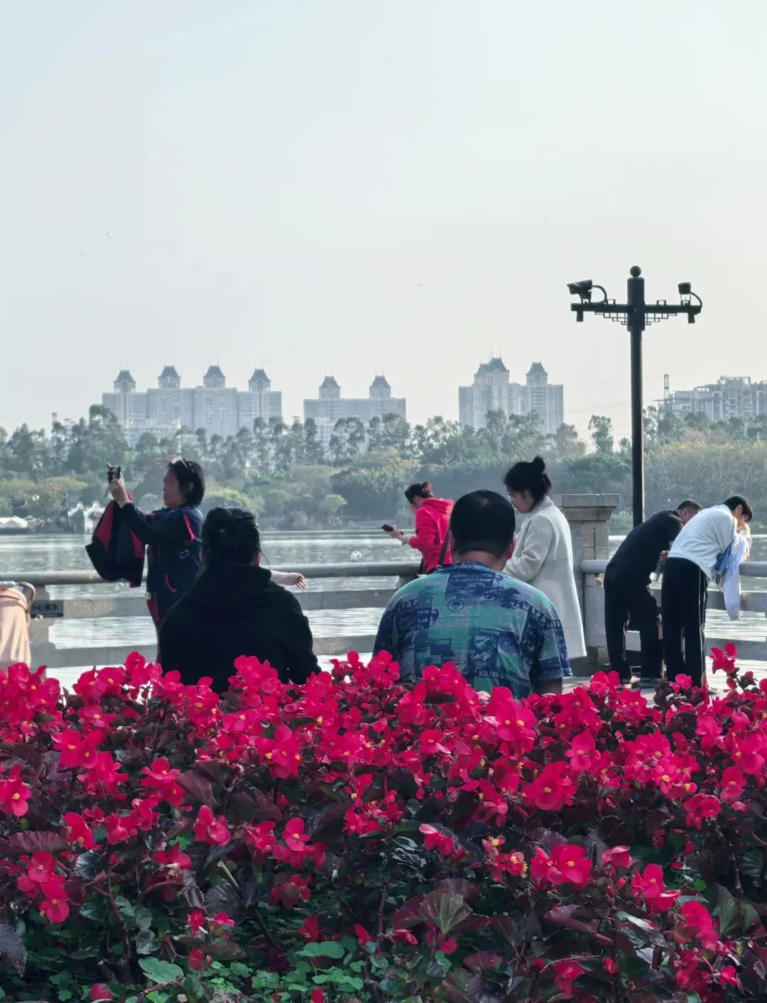 漫步花田小径,波斯菊簇拥绽放,花香沁人心脾,脚下是青石板路,身旁是碧波荡漾的海珠湖,抬眼望去,广州塔、东西塔矗立天际,塔影倒映在湖面,与花海、湖光交相辉映,完美诠释“塔映花城”的极致美感。春节假期首日,无数游客携家带口前来打卡,相机定格花与塔的相拥,笑声融进风与花的轻语,传统年味与生态美景在此完美交融,火红的灯笼点缀花海,马年的喜庆氛围扑面而来。