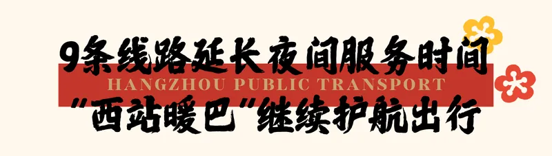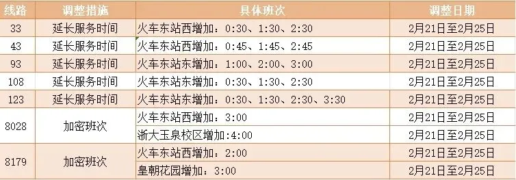 从2月21日(正月初五)起至节后的2月25日(正月初九),杭州公交将延长杭州东站始发的33、43、93、108、123路服务时间,额外增开夜间班次;夜间线路8028、8179路将在2月21日(正月初五)起至节后的2月25日(正月初九)延长服务时间。