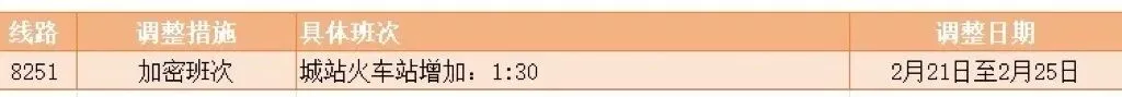 针对杭州站(城站)始发的8251路,杭州公交也将从2月21日(正月初五)起加密发车班次,具体班次与调整日期可参考下表⬇️