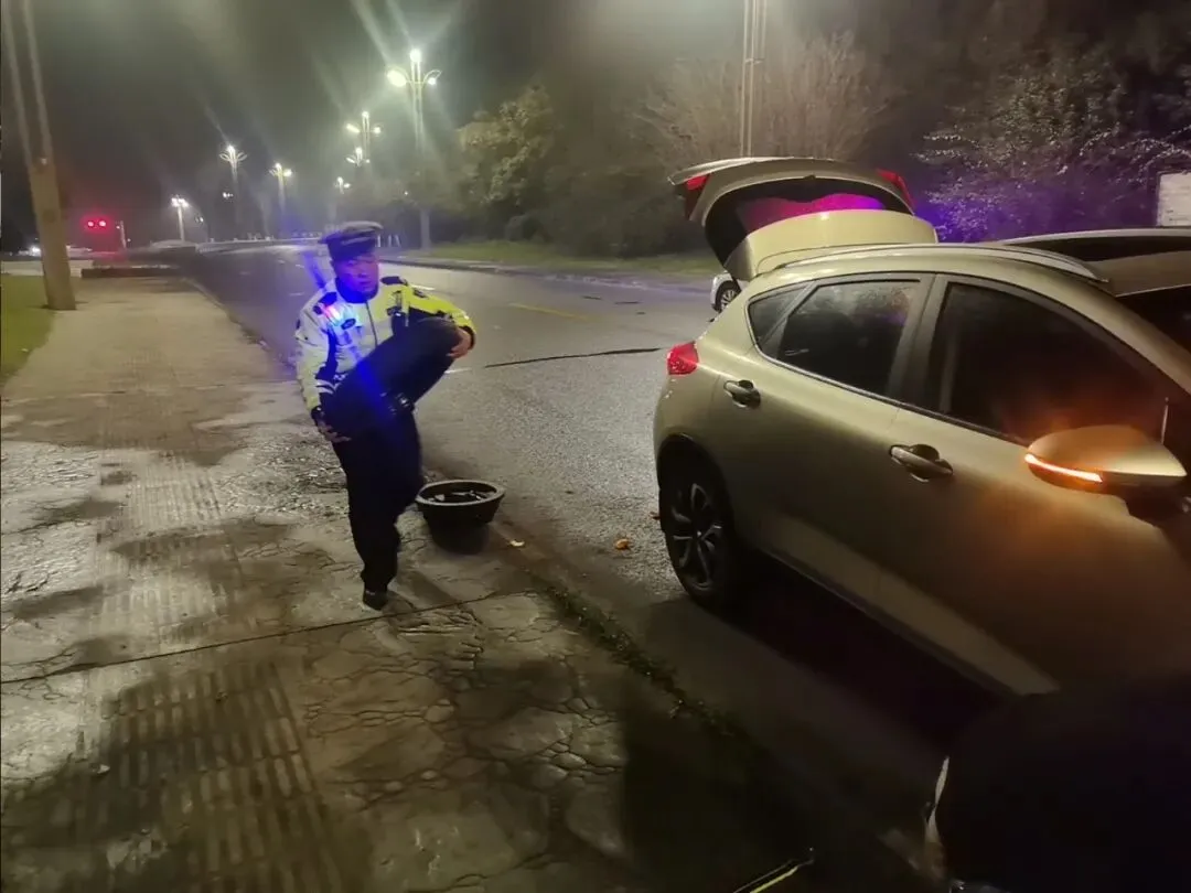 符溪中队辅警汪绍军、廖铭锟在辖区开展夜间巡逻,发现一车辆突发爆胎。交警立刻伸出援手,帮助换好轮胎,驾驶员对交警及时相助连连致谢。