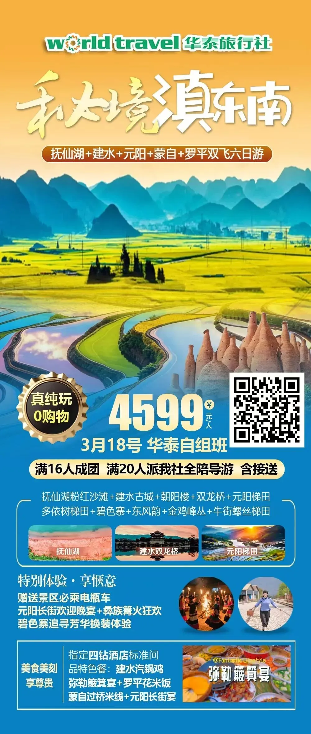 ✔ 精华景点:抚仙湖粉红沙滩、建水古城、元阳梯田、罗平金鸡峰丛......