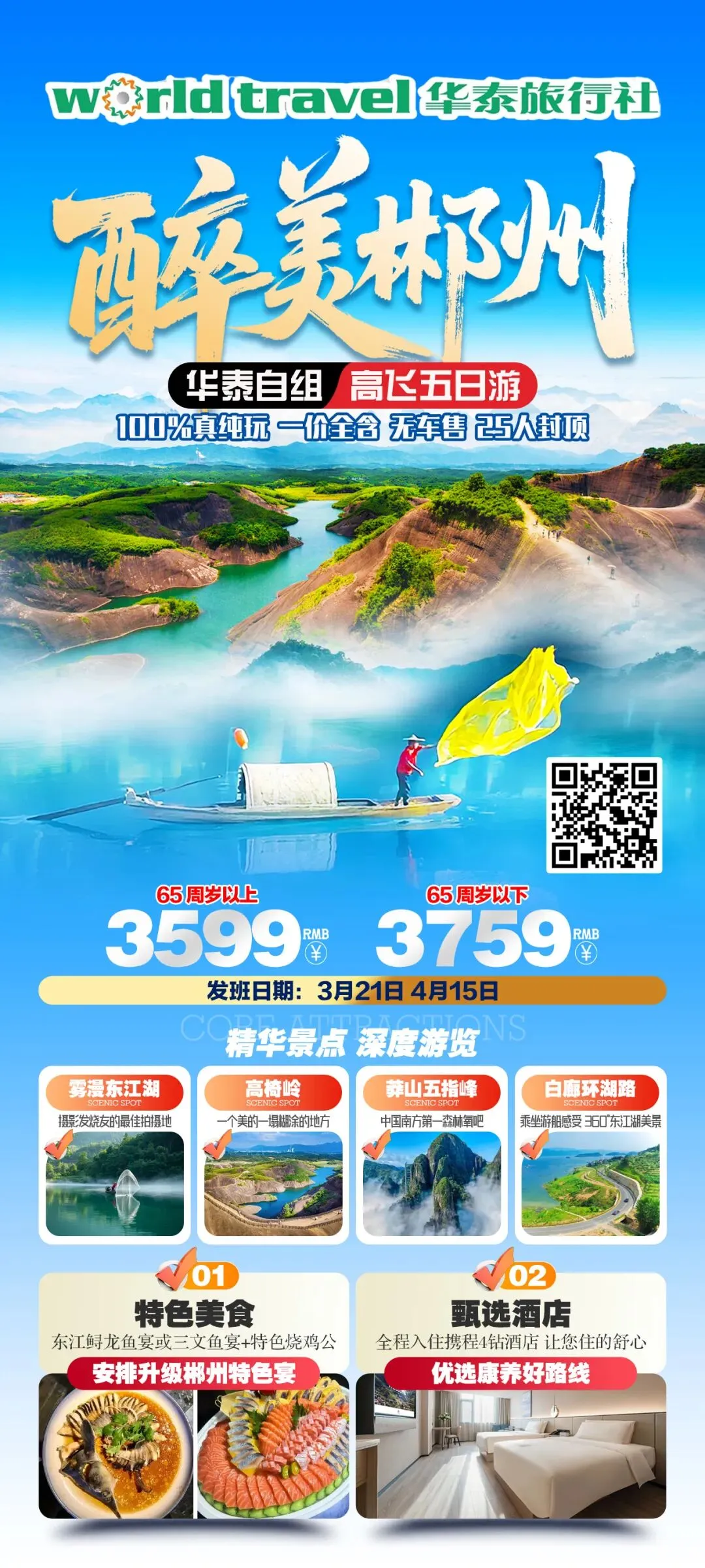 ✔ 王牌景区全包含:东江湖·雾漫小东江/高椅岭/莽山五指峰/白廊环湖路