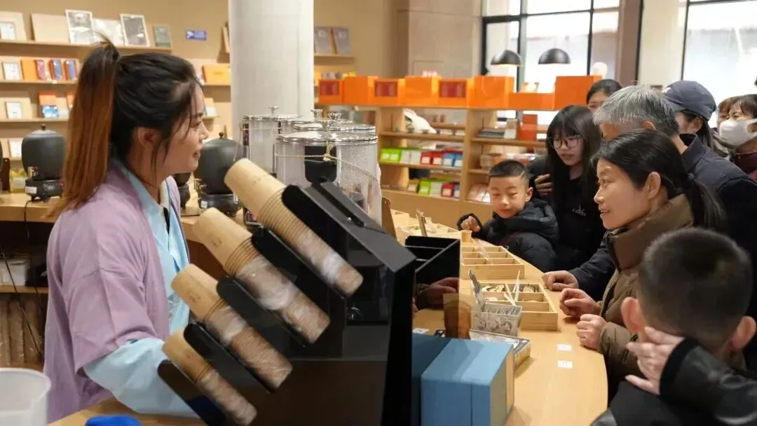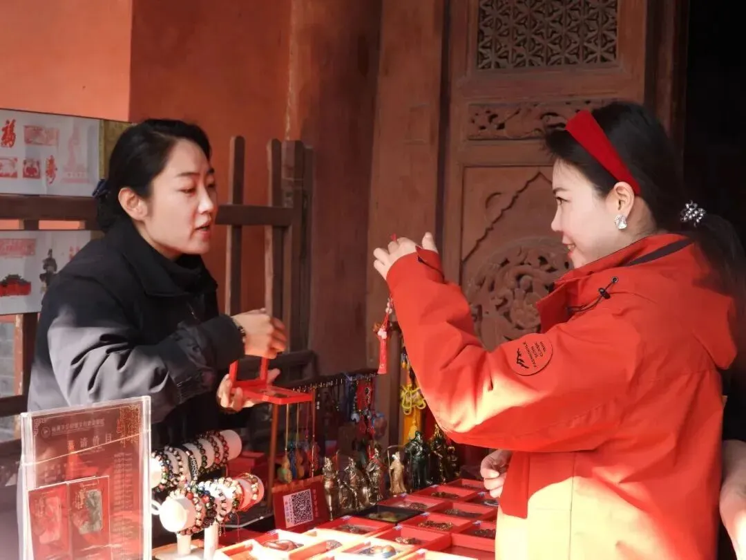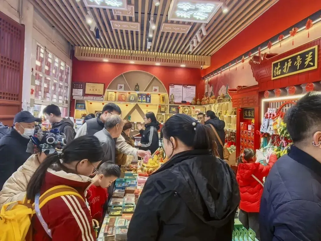 景区的各个祈福处和文创店,同样是人头攒动,大家祈愿新的一年福气满满、万事顺遂;游客们精心挑选伴手礼,把“忠义”的福气带回家。