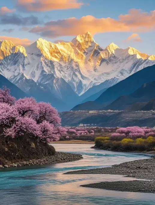 3月下旬的林芝,桃花漫山遍野,与雪山相映成趣。