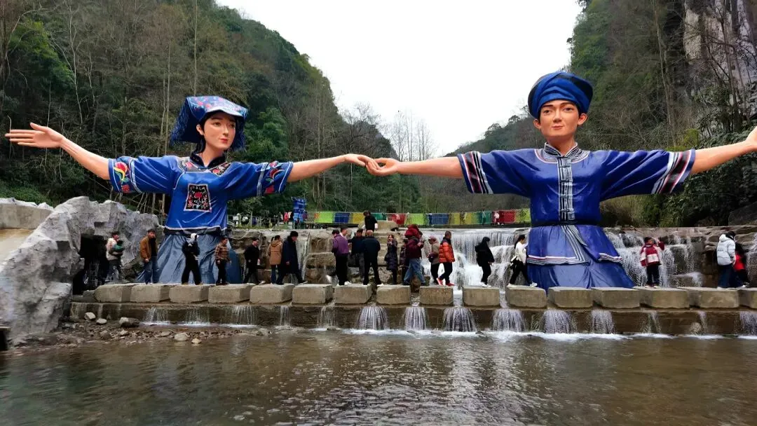 民俗添彩,年味愈浓。为抢抓春节黄金周客流,掌布景区精心筹备了南北交融的民俗表演,原生态布依山歌婉转悠扬,加上划旱船、背高装等非遗民俗表演,让这个春节假期的掌布,成了游客口中“来了就不想走”的地方。