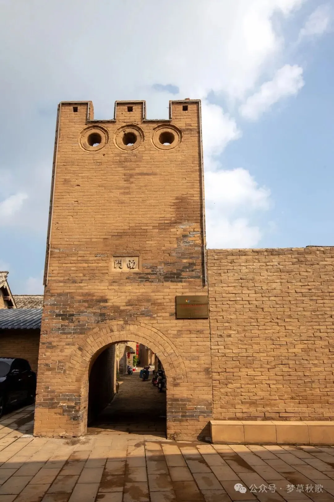 沿着青石路走向南门,这段路不算长,却越走越有感觉。脚下的青石板被岁月磨得光润如镜,倒映着两旁的黛瓦黄墙,每一步都像在触摸六百年的时光。远远望见南门的城楼,青砖斑驳,巍峨雄壮,高逾三丈的城门上,"南门"二字苍劲有力,城头炮台森然,箭孔密布,光是看着就觉得气势非凡。走到近前才发现,城门下的青石上有两个碗口大的门轴窝,深陷石中,旁侧还藏着门栓穿洞,同行的当地向导说,这都是当年防御流寇时留下的痕迹,这座城门可是守护了窦庄数百年的"功臣"。有意思的是,南门现在已经被淹没了120厘米,向导说这是常年的泥沙淤积导致的,也从侧面印证了窦庄"三面环水"的地理特征。