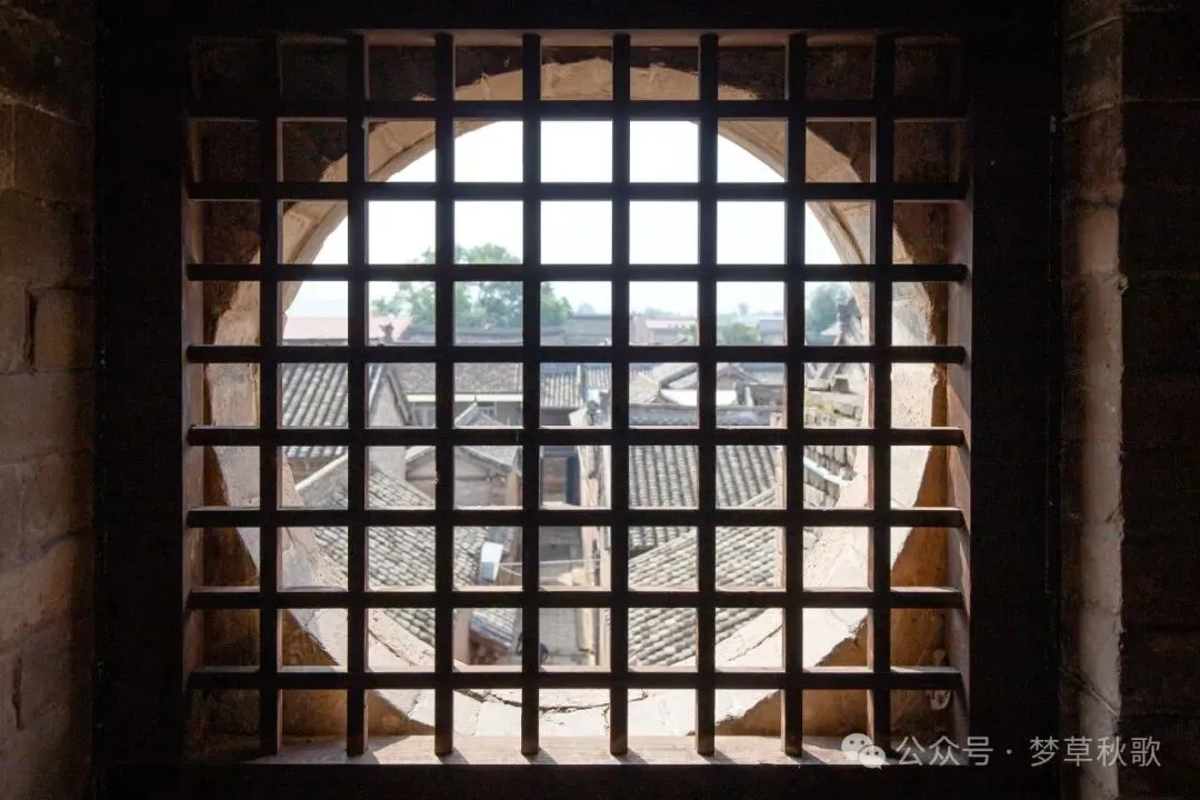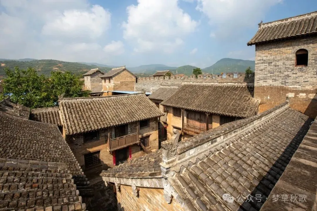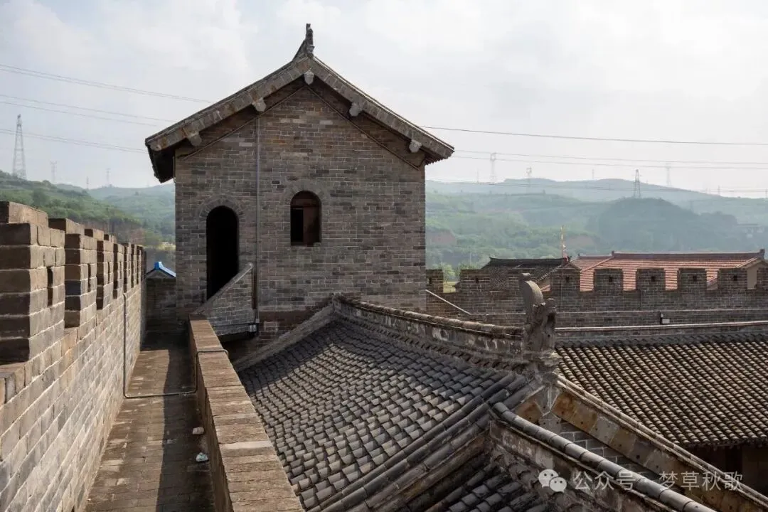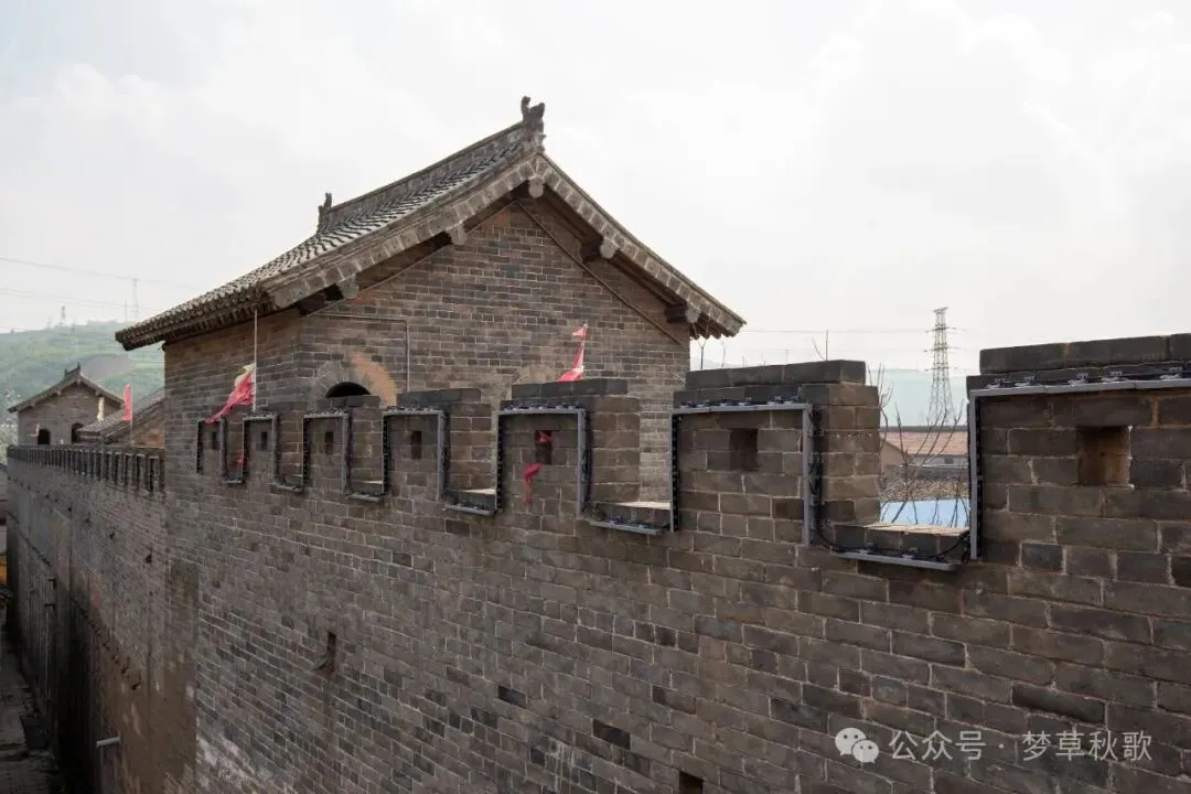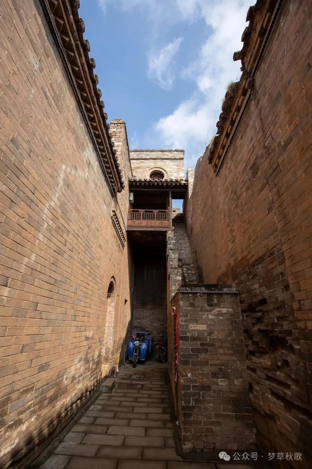 之后我们沿着城墙漫步,北门虽然墙体损坏严重,但主体建筑仍清晰可见,站在城墙上远眺,古堡全景尽收眼底。城墙以青石为基,巨砖包砌,内夯土石,虽然只剩南北段残存,但依然能看出当年的巍峨气势。据介绍,这座城堡原来东西、南北各长500米,城墙周长约2000米,高约12米,墙头宽约1.5米,四角还筑有五层碉楼,城外绕墙设置藏兵洞,每洞能容五人藏身,部分城段还有暗道,防御体系完备得像个铁桶。俯瞰堡内,街巷如棋盘纵横,百十院落连绵成片,黑瓦如鳞,飞檐戗角上的吻兽望天欲飞,静中寓动,灵气盎然。