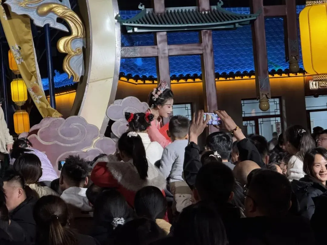 四场实景演出轮番登场,光影交织,演绎大宋风云与江湖豪情;NPC身着古装穿梭长街,拱手问安、互动传福,沉浸式的场景体验,让每一位游客都能“一秒入宋”,在古风雅韵中感受不一样的新春盛宴。