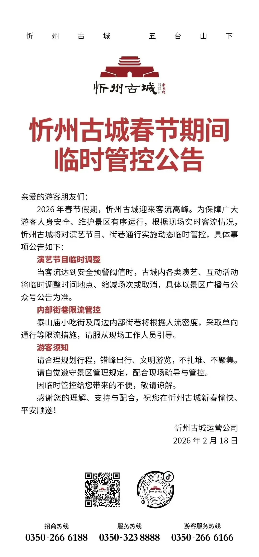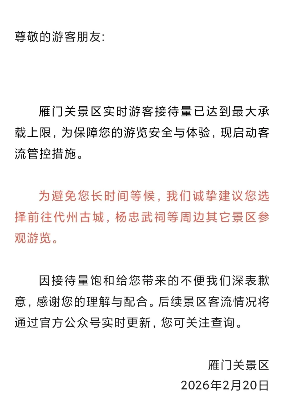 您现在的位置是:首页 > 国内旅游目的推荐 > 正文 国内旅游目的推荐 山西忻州三景区春节假期历史性火爆!已开启限行管控!请游客周知! admin2026年02月20日 22:16:04国内旅游目的推荐9 山西忻州三景区春节假期历史性火爆!已开启限行管控!请游客周知!山西忻州雁门关景区通告 转载请说明来源于"旅荐网",部分内容转载自网络,如有侵权请联系qlwl@foxmail.com删除 本文地址:https://www.15386.cn/post/116863.html 上一篇 绍兴知名景区,发布限流公告! 下一篇 投票中!沙湾和桥南,哪些商圈景区,你愿意去消费消遣?暂时领先的是…… 相关文章 河池旅游攻略|广西秘境山水·长寿人文全景指南 广州周末游玩攻略——广东惠州 早5晚9兼职142天,我的存钱旅行计划成功了 威海旅游!不做攻略��白去线路美食 【竞赛通知】第二十届全国大学生文化旅游与会展竞赛云南省省赛的通知 【营口】游玩攻略,美食打卡,旅游必玩景点推荐 【营口】游玩攻略,美食打卡,旅游必玩景点推荐 【营口】游玩攻略,美食打卡,旅游必玩景点推荐 广州周末周边游十佳景点攻略|1-2 小时直达,解锁松弛感短途出行 4-6月出川西旅游攻略看这一篇就够了 发表评论 取消回复 评论列表 这篇文章还没有收到评论,赶紧来抢沙发吧~