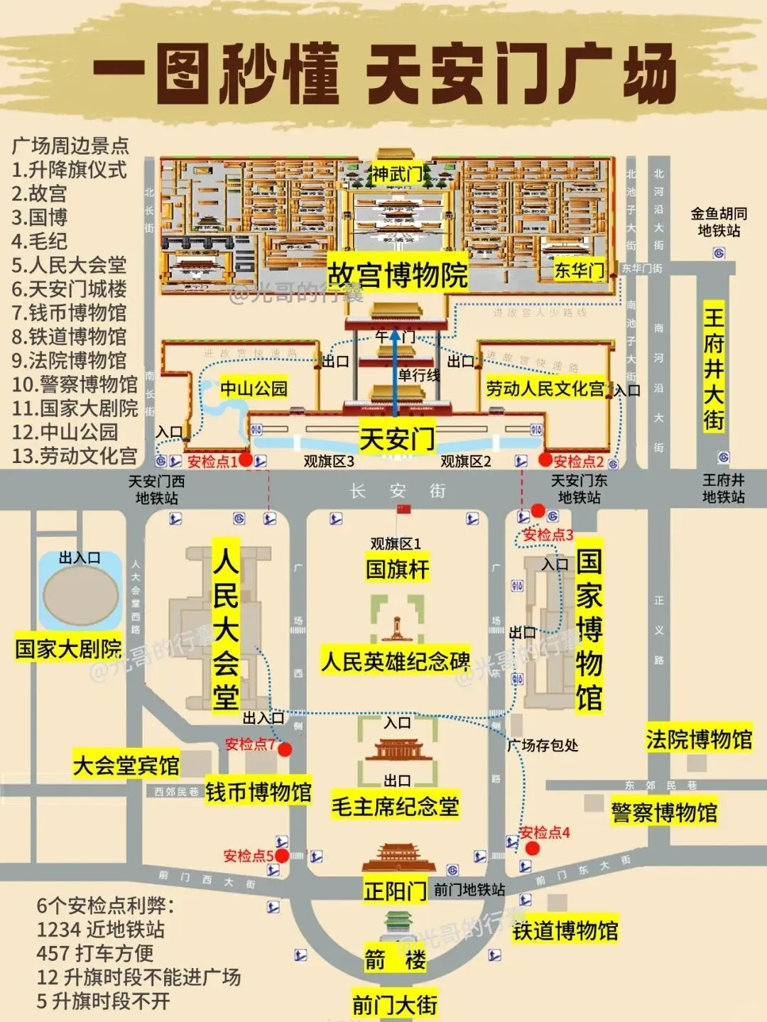 ①毛主席纪念堂不得携带大小包、照相机、水壶等入场参观,请交至导游看管后再排队参观,期间每人都需进行景点安检。由于天安门广及故宫游览面积比较大,需要从故宫中走出来到方便上车的地方才能登车,本日午餐时间较迟,建议自备一些点心充饥。