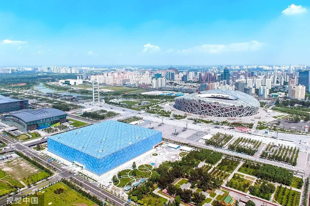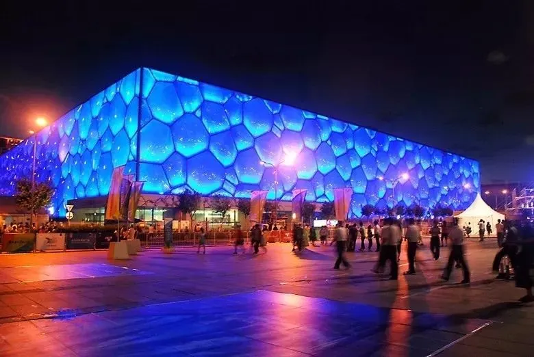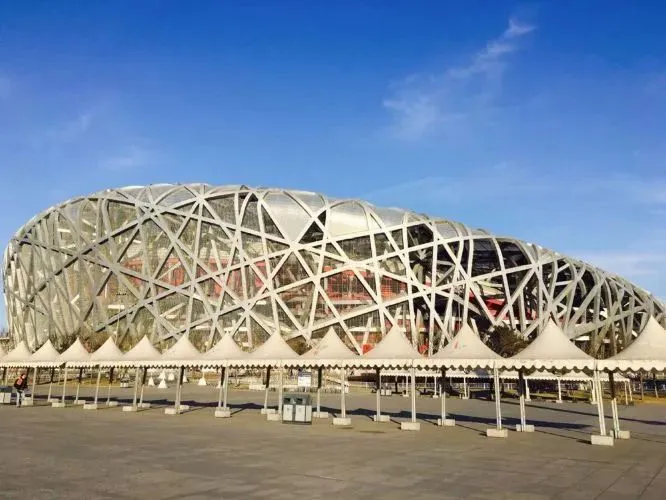 前往【奥林匹克公园】,参观 2008 年北京奥运会主场馆【鸟巢外景】整个体育场结构的组件相互支撑,形成网格状的构架,外观看上去就仿若树枝织成的鸟巢,在这里,中国传统文化中镂空的手法、陶瓷的纹路、红色的灿烂与热烈,与现代最先进的钢结构设计完美地相融在一起。充满魔幻色彩的水蓝色建筑【水立方外景】场馆外观如同一个冰晶状的立方体,造型简洁现代。水立方的内外立面膜结构共由3065个气枕组成。